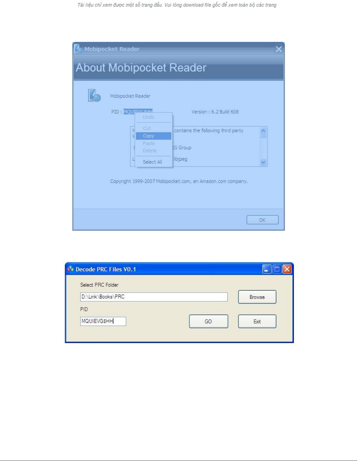 Chạy Mobipocket Reader. Vào Help (Dấu hỏi). Chọn About. Copy PID.
