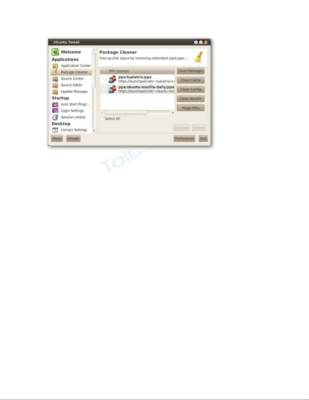 Mở Ubuntu Tweak và chọn Package Cleaner tại cửa sổ bên