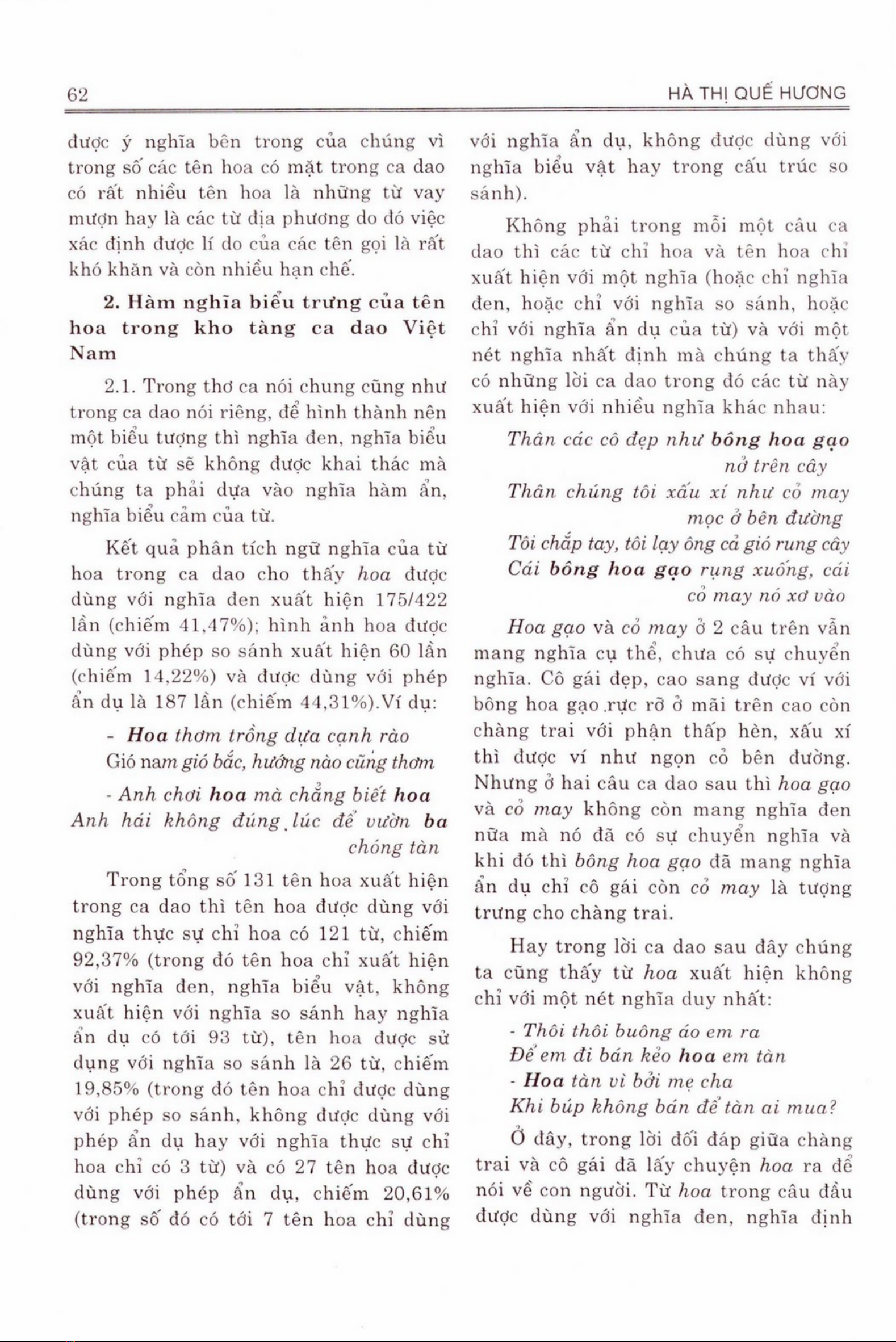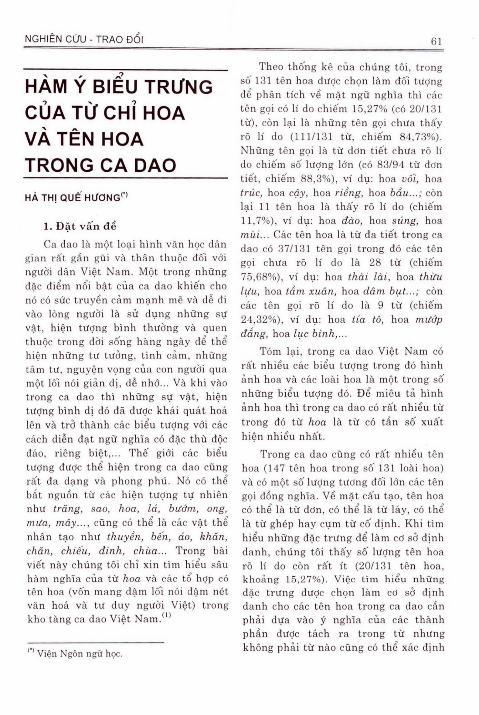 Bài viết phân tích hàm ý biểu trưng của các từ chỉ hoa và tên hoa trong ca dao Việt Nam, làm sáng tỏ mối liên hệ giữa ngôn ngữ, hình ảnh và ý nghĩa. Ca dao xem là một dạng nghệ thuật sử dụng ngôn từ và sức gợi hình mạnh mẽ, phản ánh tâm tư, tình cảm và quan niệm sống của người Việt.