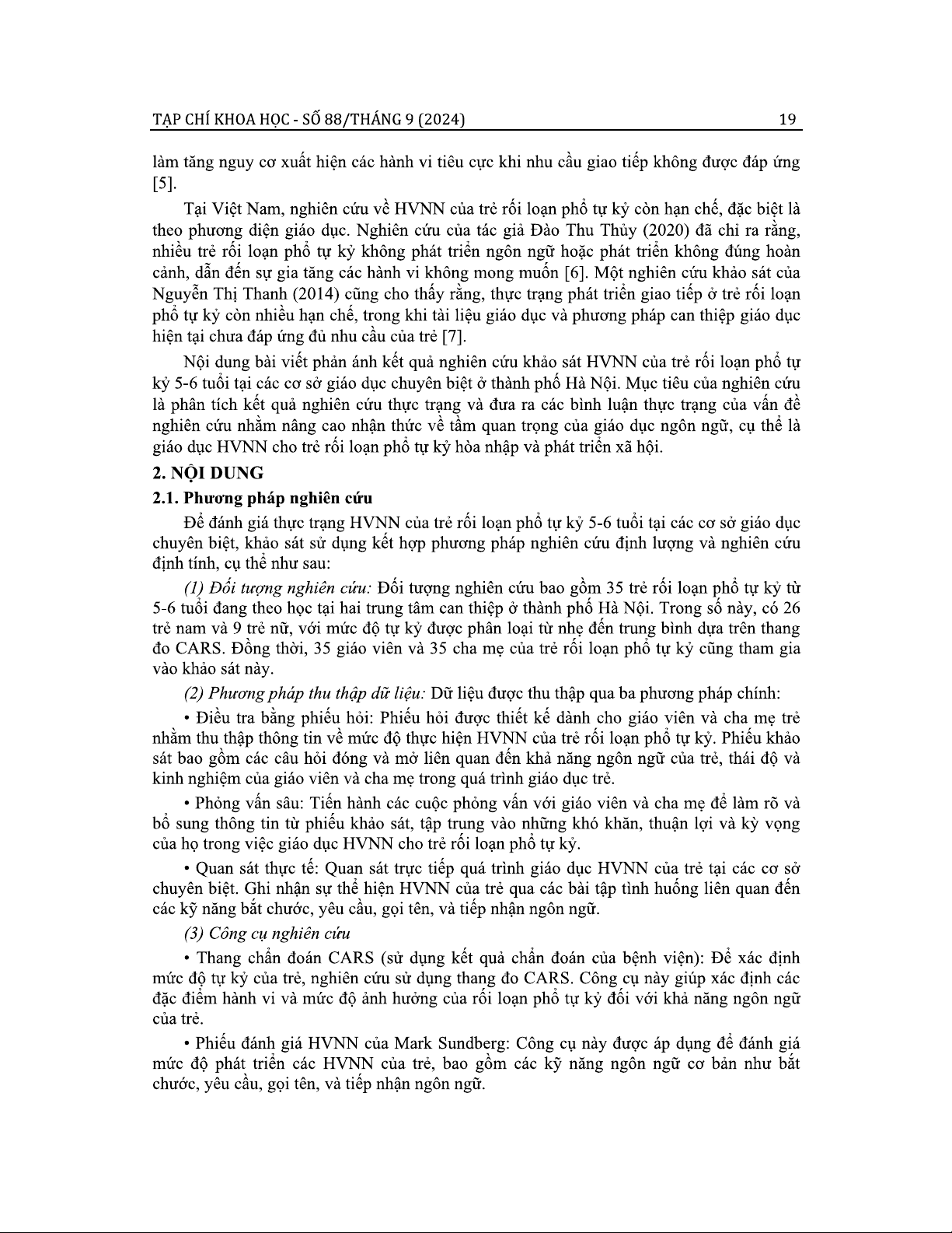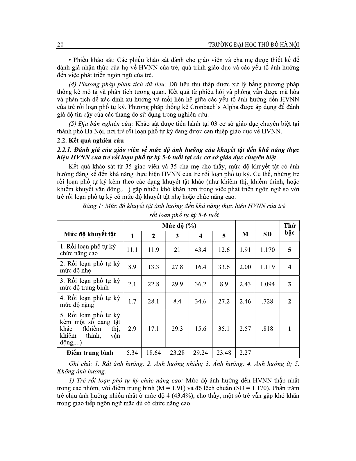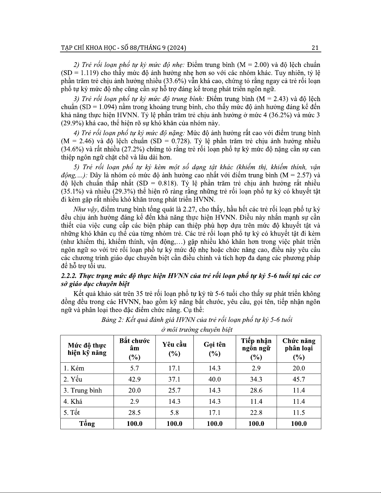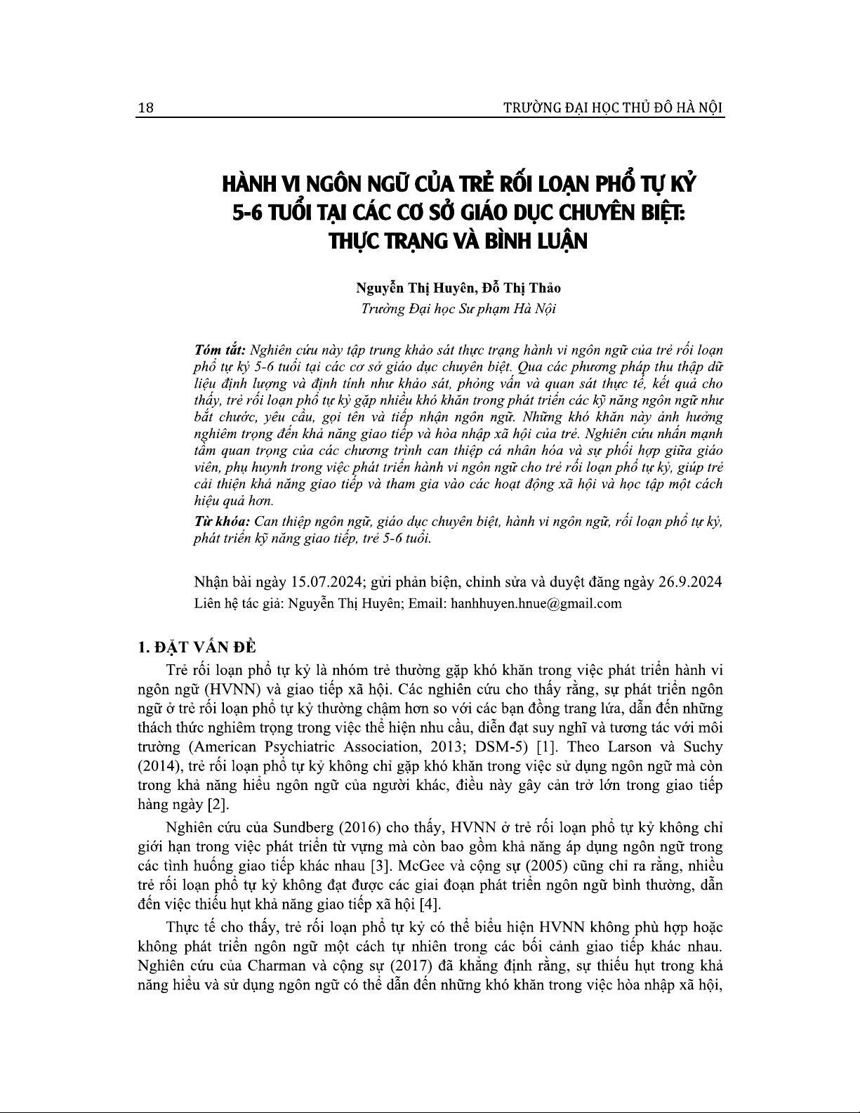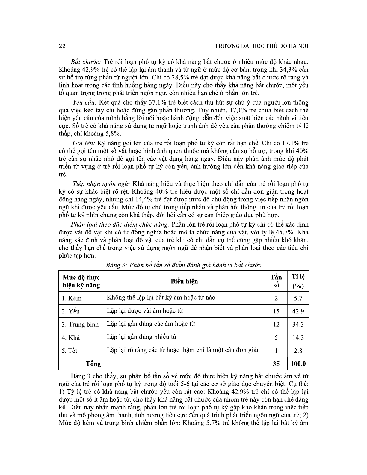 Nghiên cứu này về hành vi ngôn ngữ của trẻ rối loạn phổ tự kỷ 5-6 tuổi tại các cơ sở giáo dục chuyên biệt cho thấy, trẻ gặp nhiều khó khăn trong phát triển kỹ năng ngôn ngữ. Qua khảo sát và phỏng vấn, kết quả cho thấy trẻ có nhiều hạn chế trong các kỹ năng như bắt chước, yêu cầu, gọi tên và tiếp nhận ngông ngữ. Nghiên cứu này chỉ ra rằng trẻ rối loạn phổ tự kỷ gặp khó khăn trong giao tiếp và tương tác với người khác.