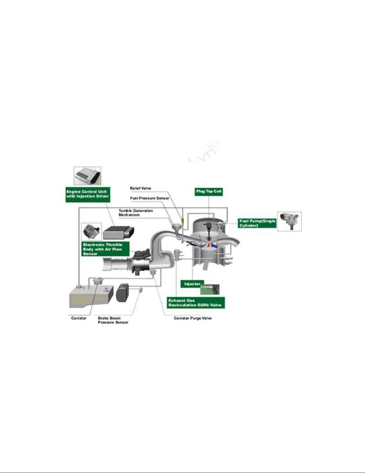 Hệ thống nhiên liệu của động cơ GDI về cơ bản bao gồm: bơm tạo áp suất phun,