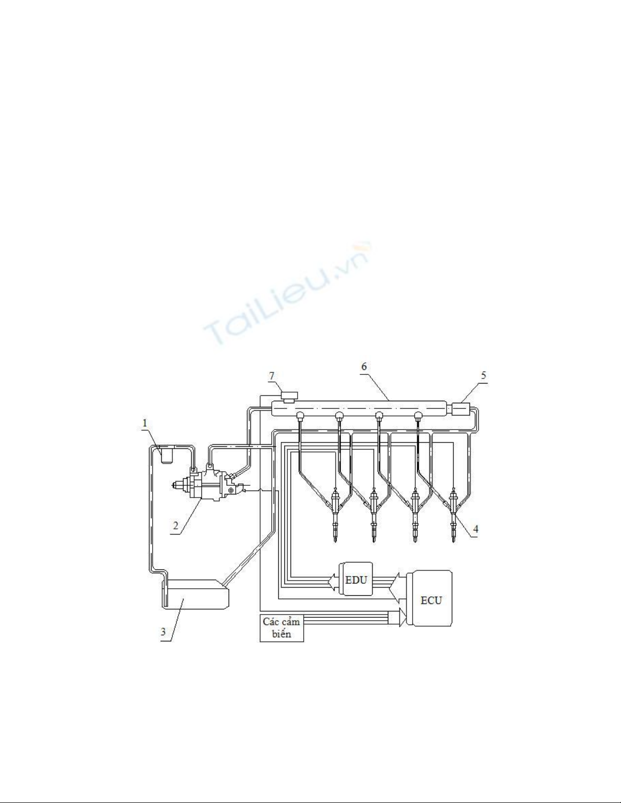 1- Lọc nhiên liệu; 2- Bơm cao áp; 3- Thùng nhiên liệu; 4- Vòi phun; 5- Bộ giới