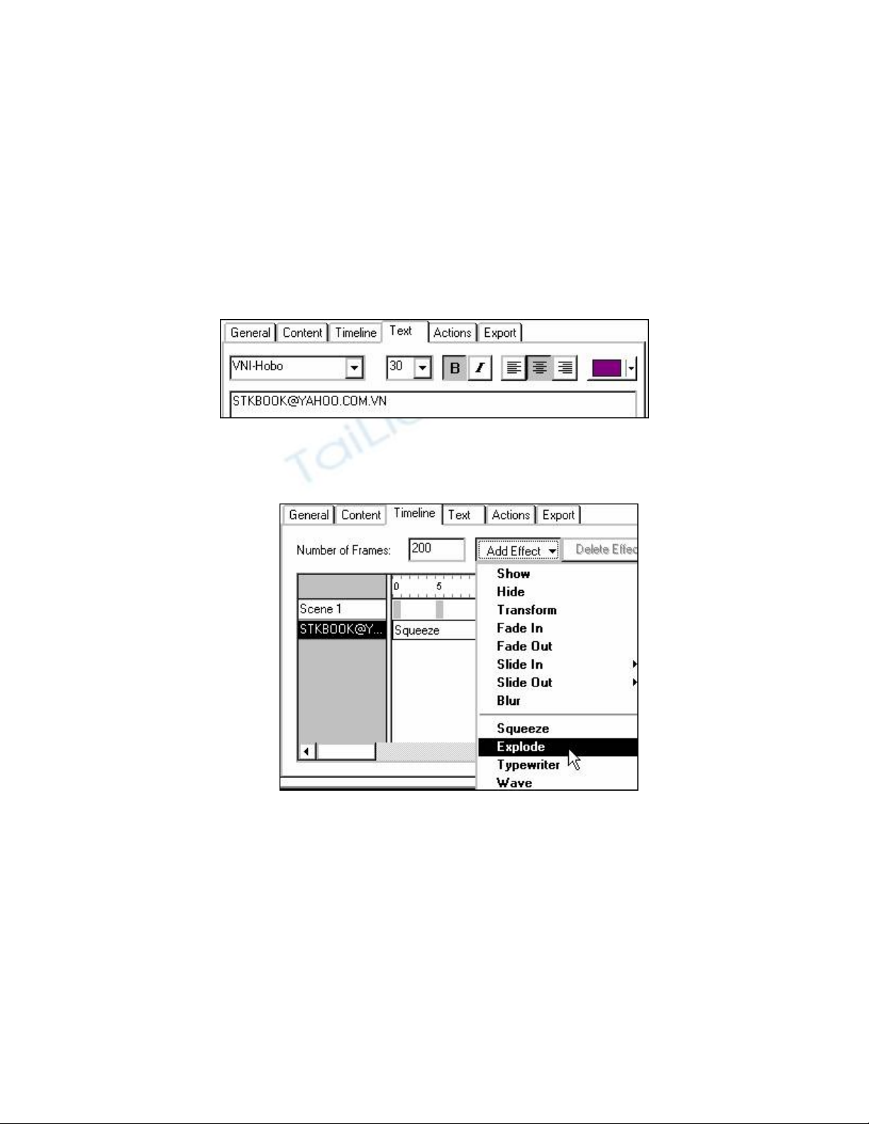 nhập dòng chữ HIỆU ỨNG EXPLODE, font VNI-Hobo, kích cỡ 30, in đậm, canh giữa, màu