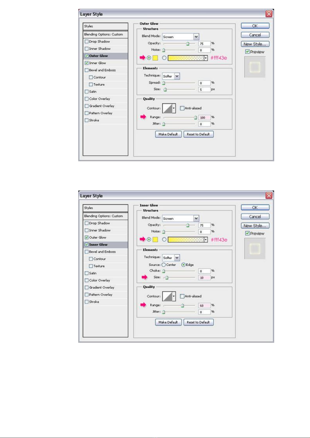 - Outer Glow: Thay đổi màu là # fff43e, và tăng Range đến 100.