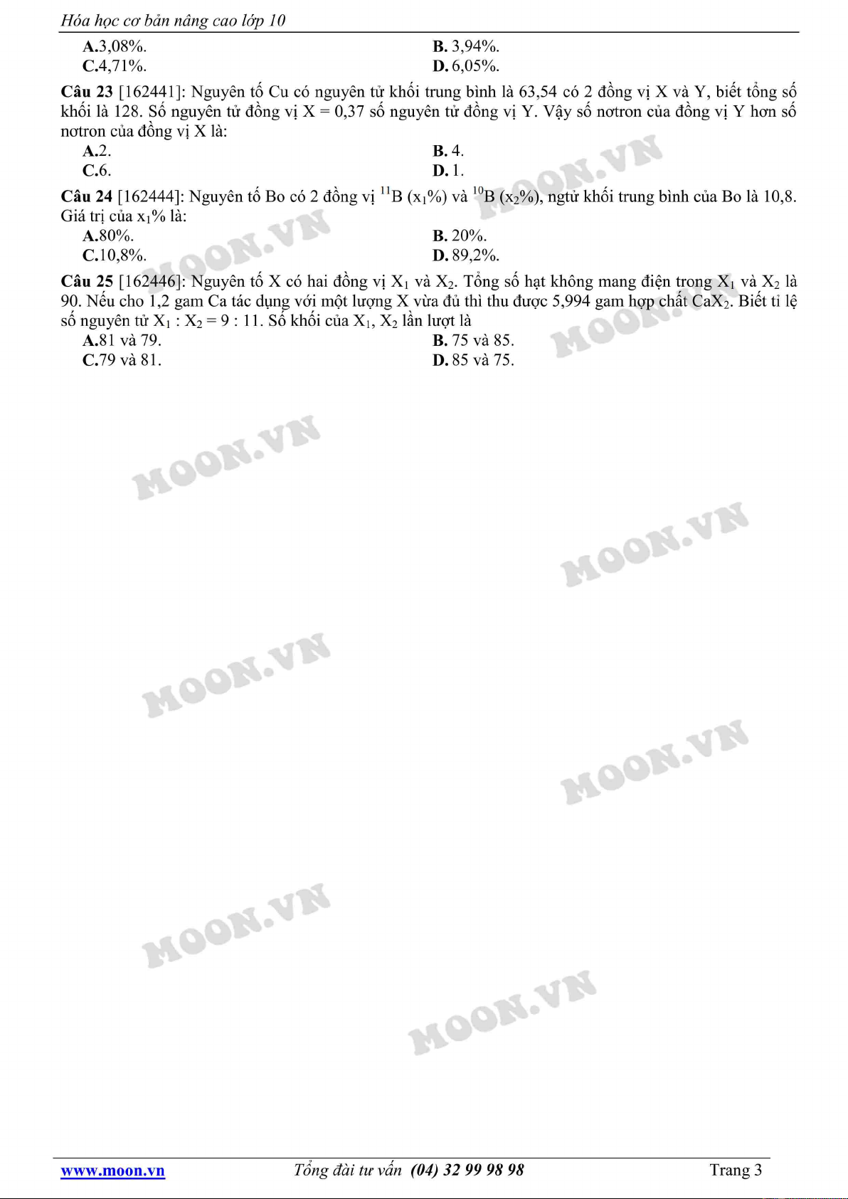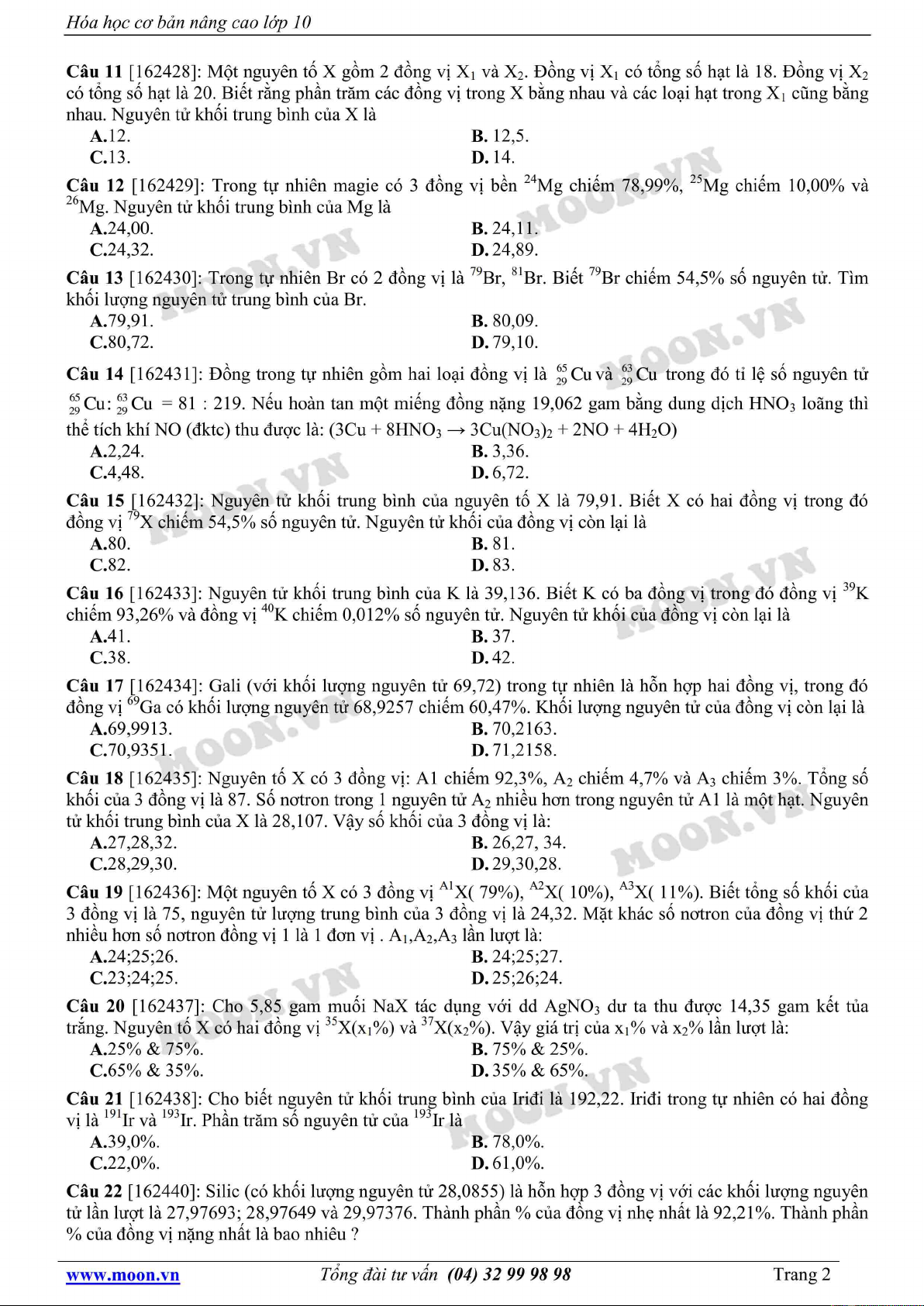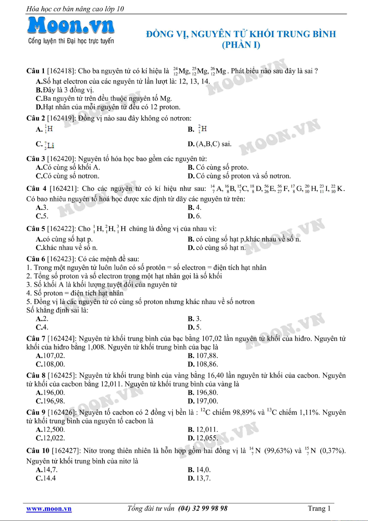 Tài liệu "Hóa học lớp 10: Đồng vị, nguyên tử khối trung bình (Phần 1)" gồm 25 câu hỏi lý thuyết và bài tập với hình thức trắc nghiệm. Mời các bạn cùng tham khảo để ôn tập và bổ sung kiến thức đạt hiệu quả cao.