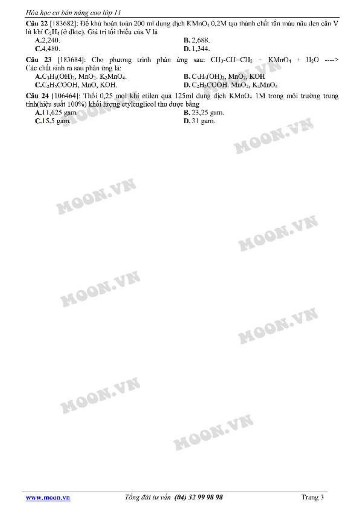 Hóa học lớp 11: Hidrocacbon không no-Phản ứng oxi hóa (Đề 2)