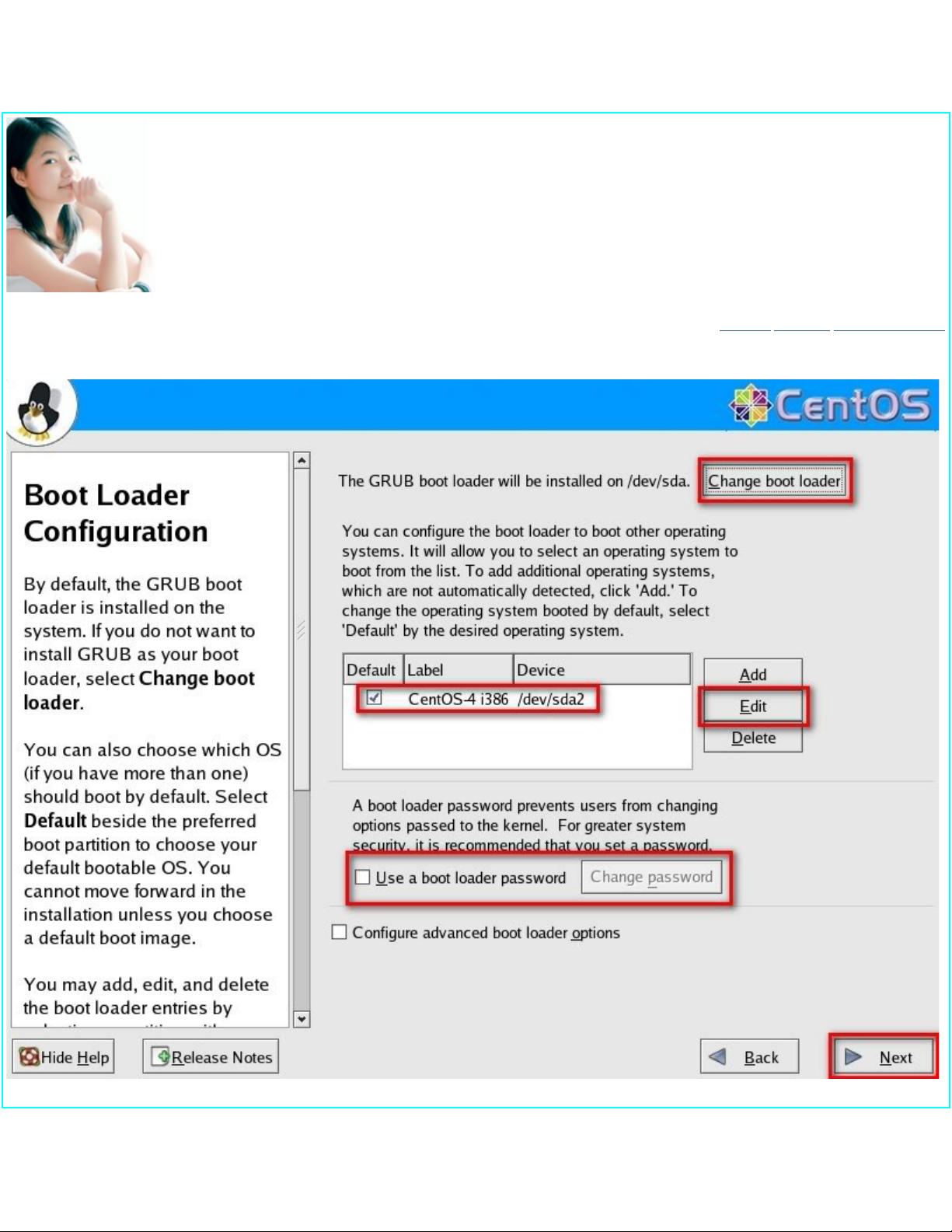 Hình 13 cho phép c u hình Boot Loader. Centos s d ng GRUB – m t ch ng trình qu n lý boot và GRUB đ cấ ử ụ ộ ươ ả ượ