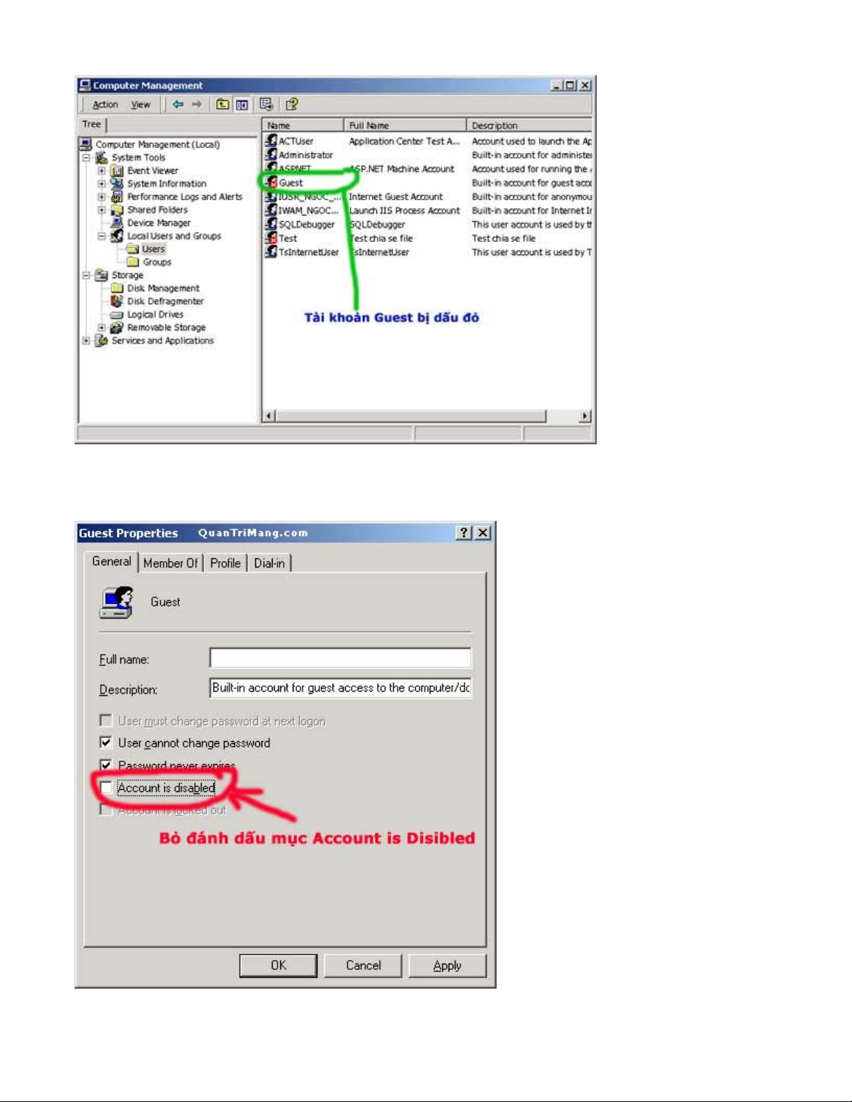 chìa khoá là đây thì vấn đề trở lên quá đơn giản phải không? Bạn chỉ việc Enable (mở) tài khoản Guest