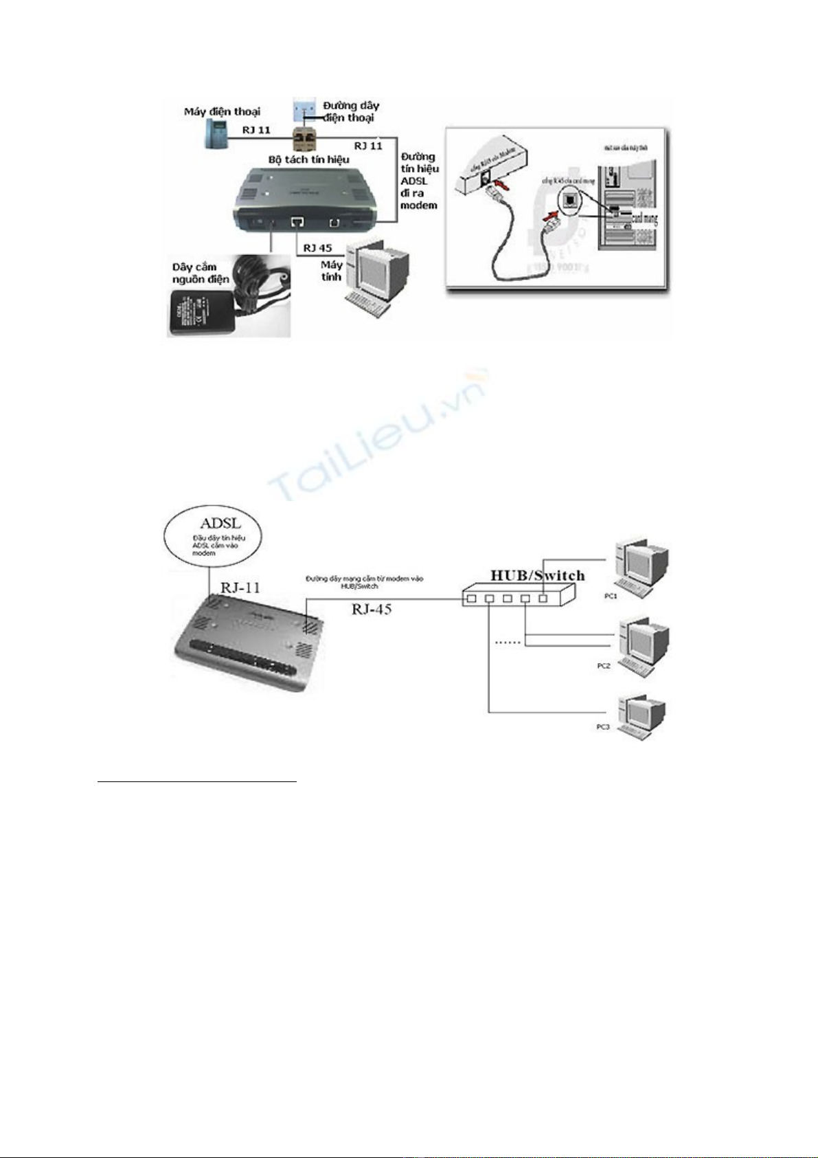 từ ngoài vào cắm qua bộ tách tín hiệu (dây chung thoại), 1 đầu ra tín hiệu ADSL cắm vào cổng RJ11 của modem, 1