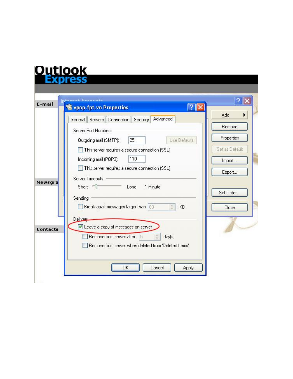 . Sau đó , vào tab Advanced chọn Leave a copy of messages on server như hình dưới đây