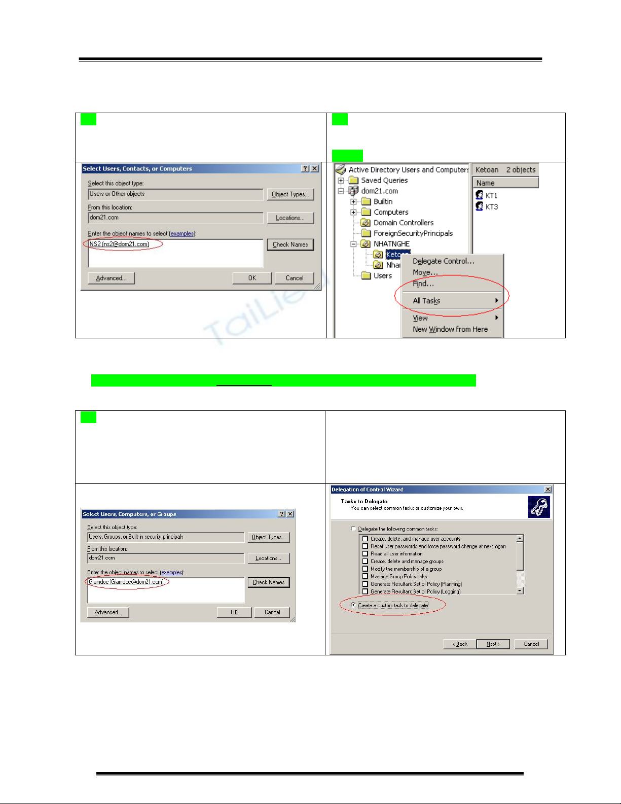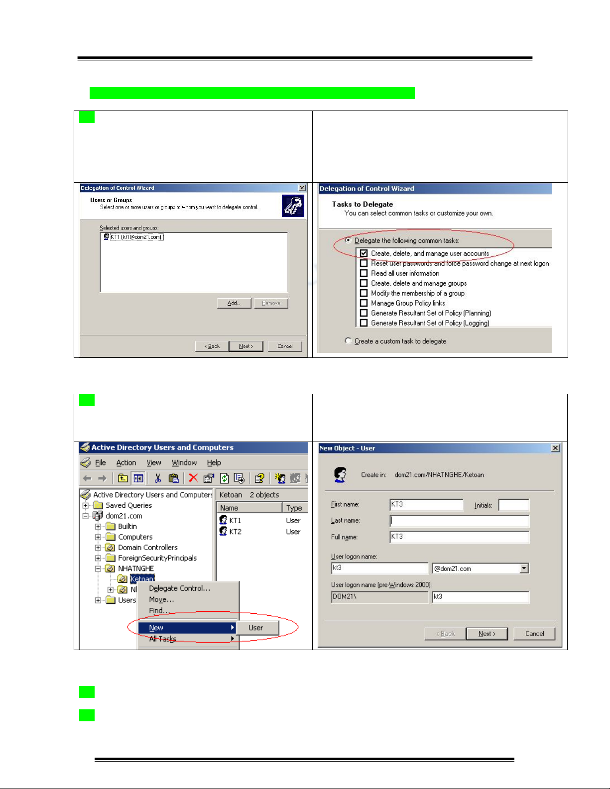 1. Phân quyền cho user “KT1” quản lý các user accounts trong OU “Ketoan”