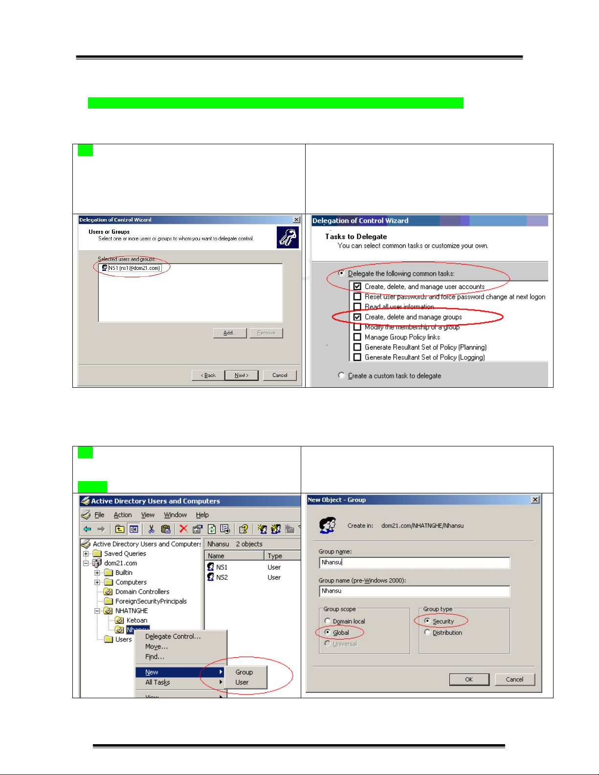 - User NS1 có quyền quản lý users accounts và Groups trong OU Nhansu