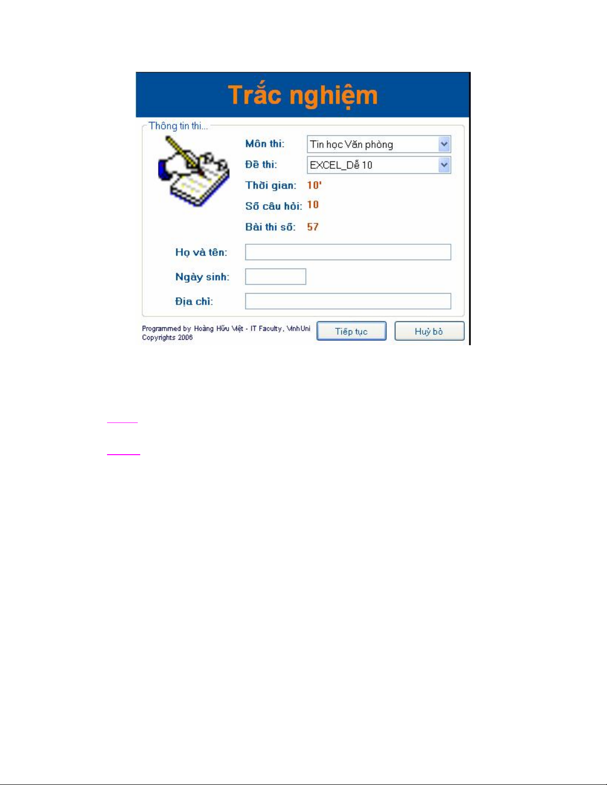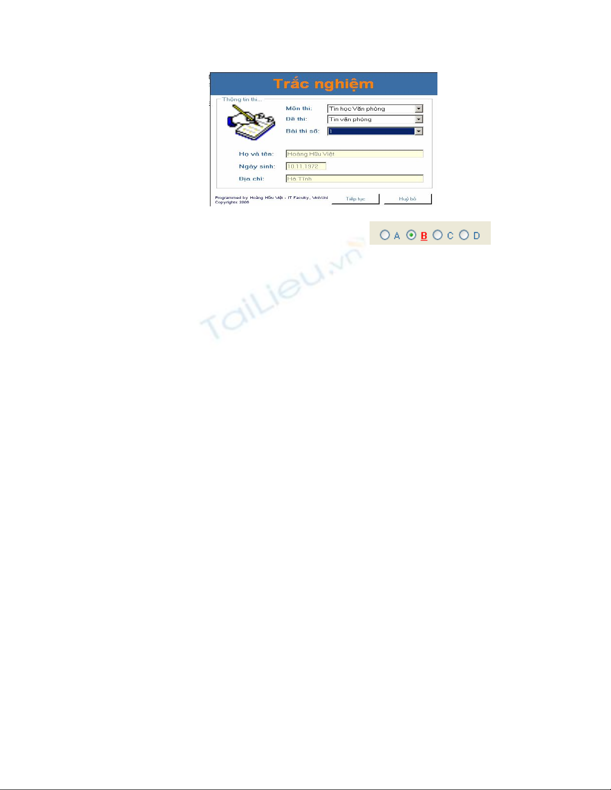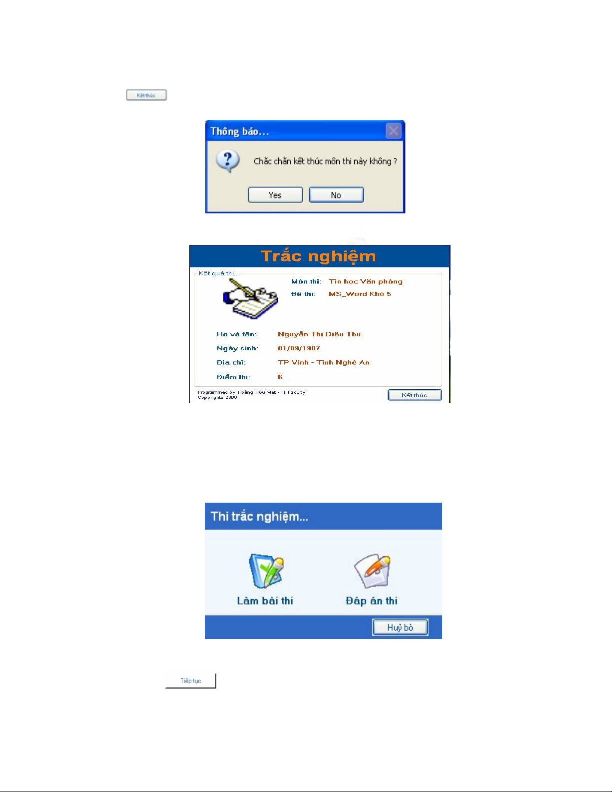 Nếu muốn tiếp tục làm bài thi bạn nháy chuột vào nút “Tiếp tục”, nếu