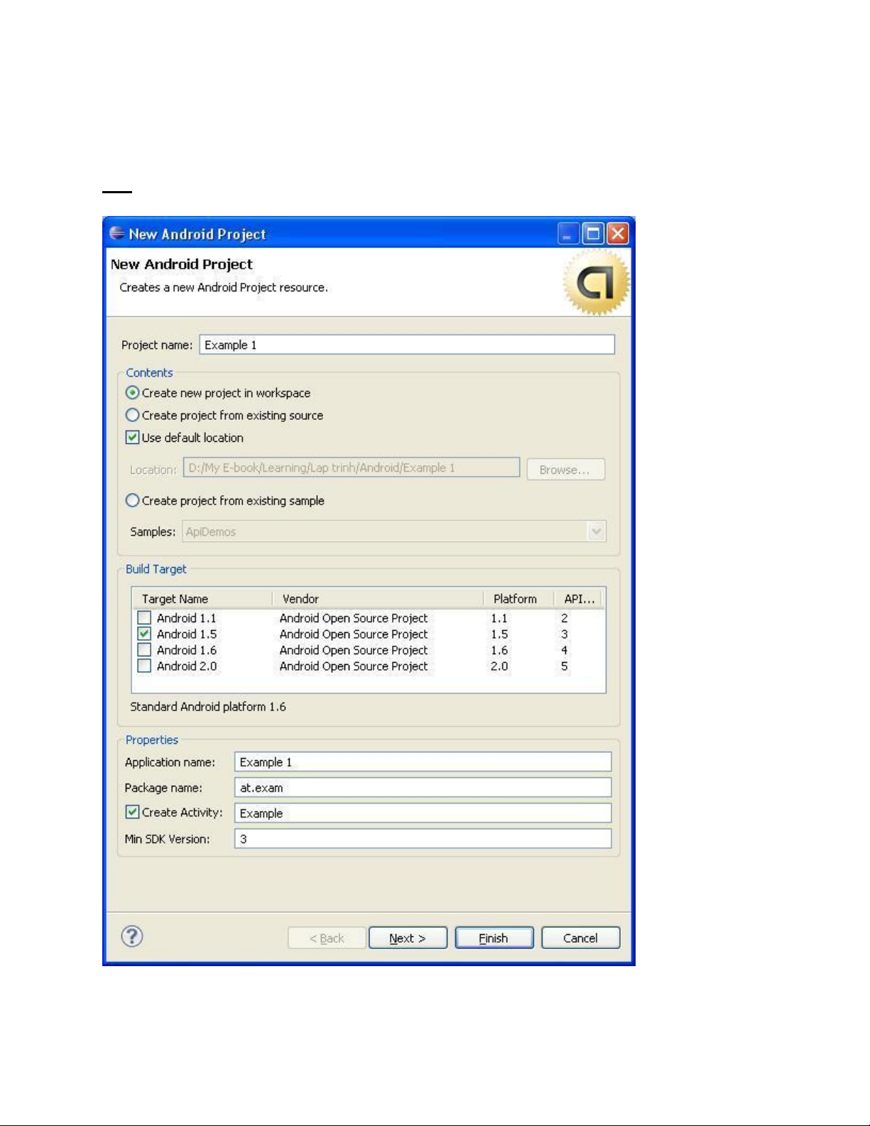 Build Target: Chọn Android 1.5 (mới nhất là 2.1 nhưng hiện tại bạn chưa cần quan