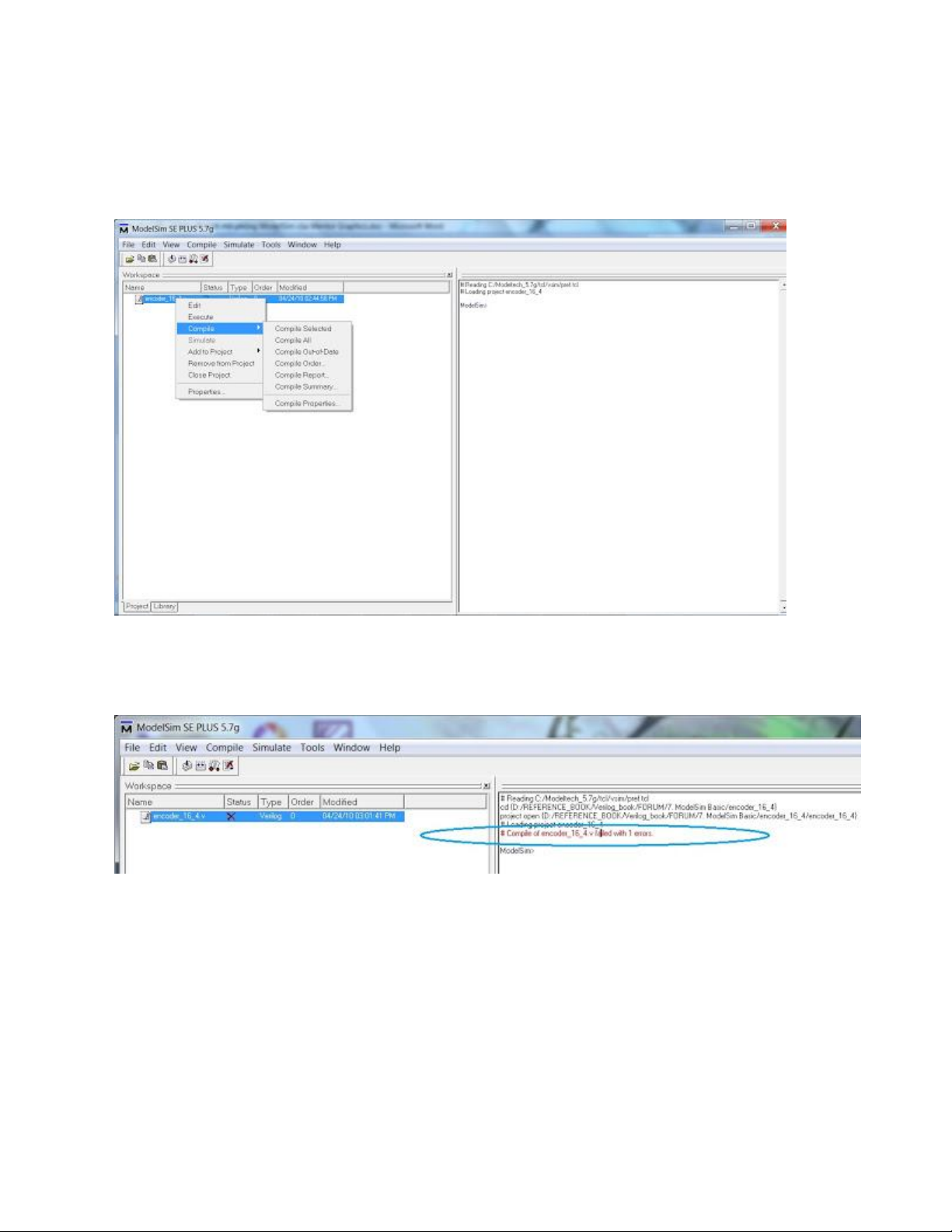Bước 6: Sửa lỗi (nếu có). Nếu có lỗi, ModelSim sẽ hiện dòng chữ đỏ