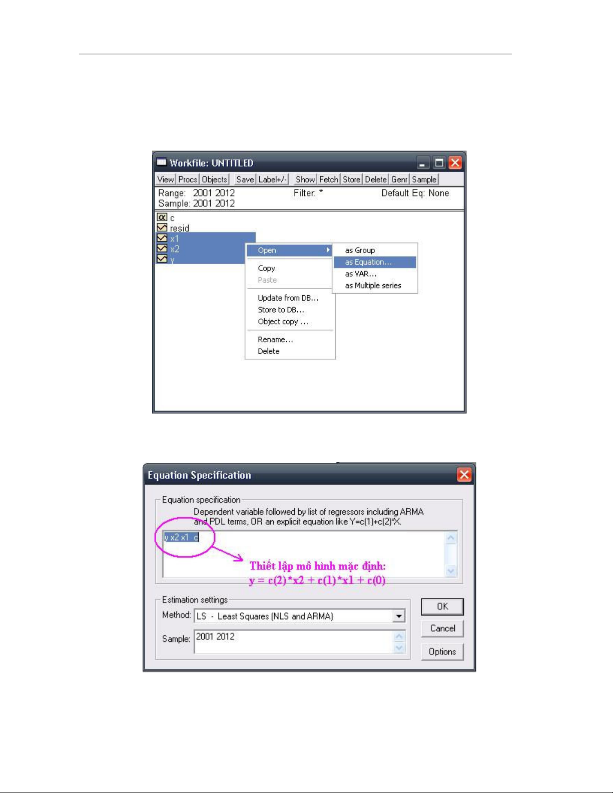 Trong vùng Equation Specification, ta có hai cách xây dng mô hình hi quy