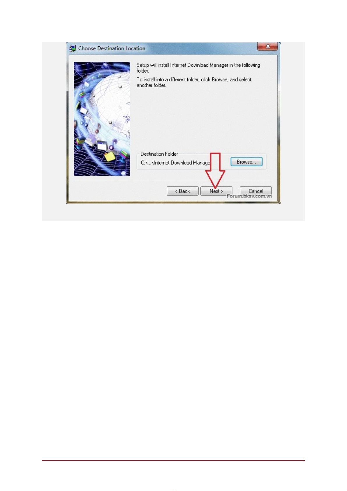 Mặc định IDM sẽ cài ở ổ đĩa C, nếu không muốn thay đổi thư mục cài đặt, bấm Next để tiếp tục