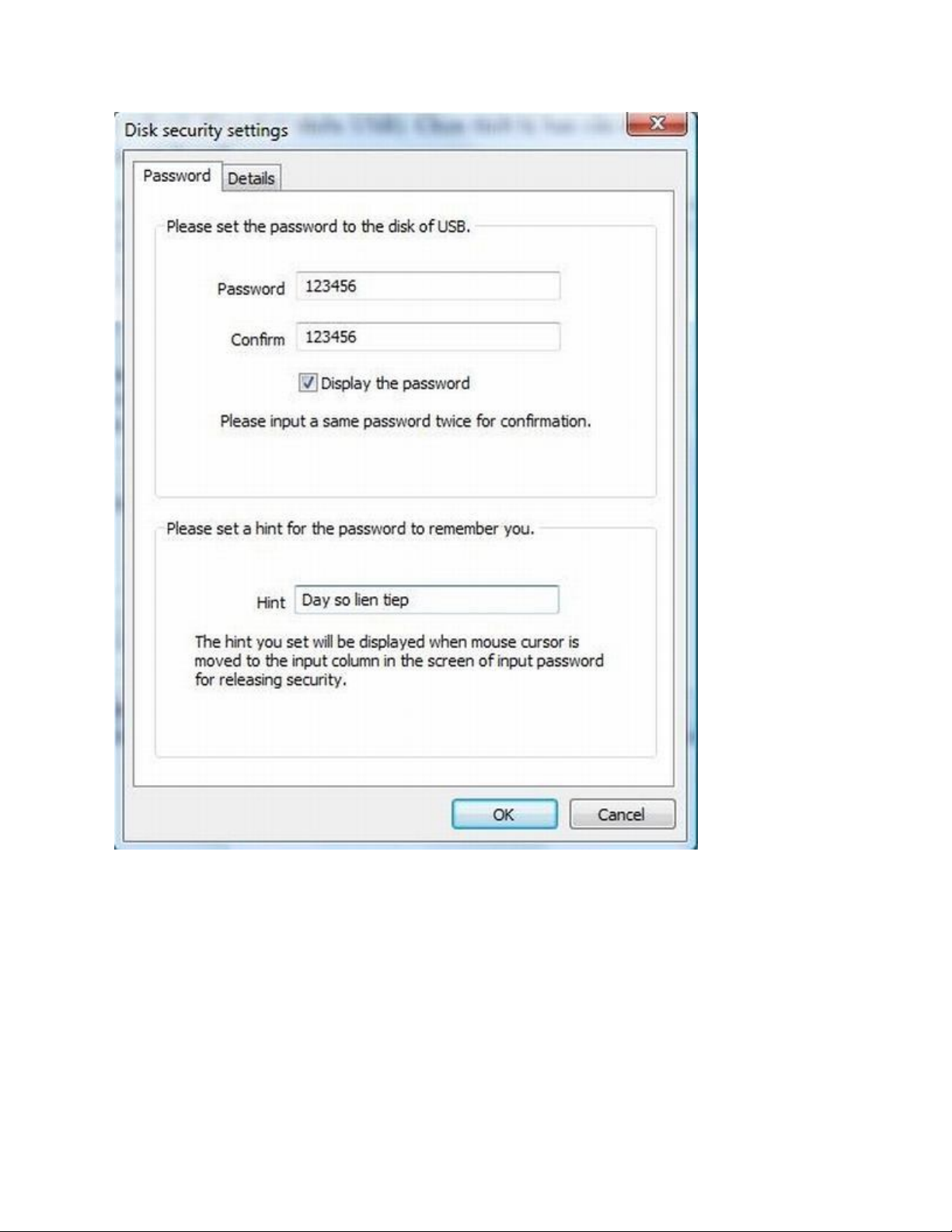 Sau đó bạn điền và xác nhận mật khẩu để bảo vệ dữ liệu trên USB. Tại mục Hint bên