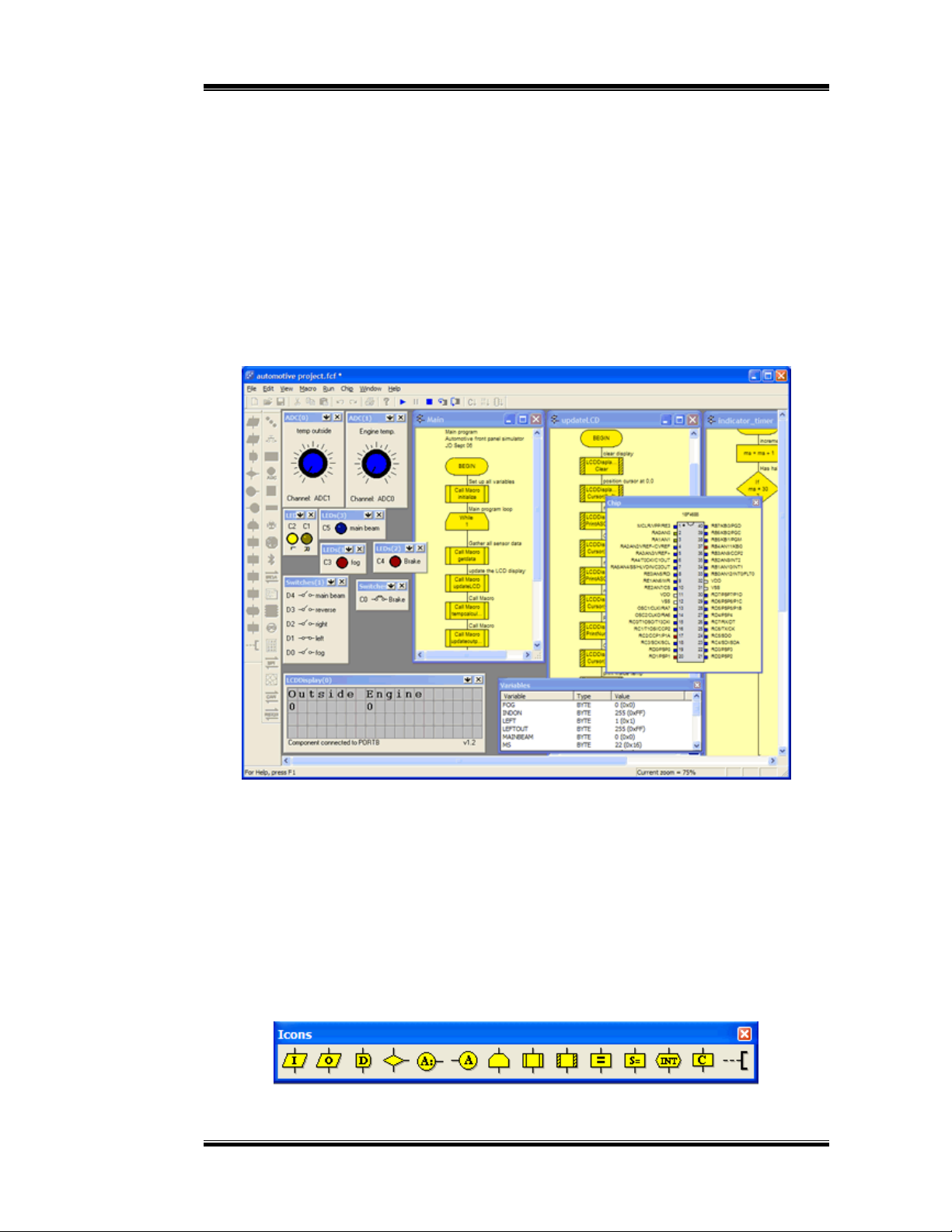 Môi trường lập trình Flowcode bao gồm một khu vực hoạt động chính, trong đó