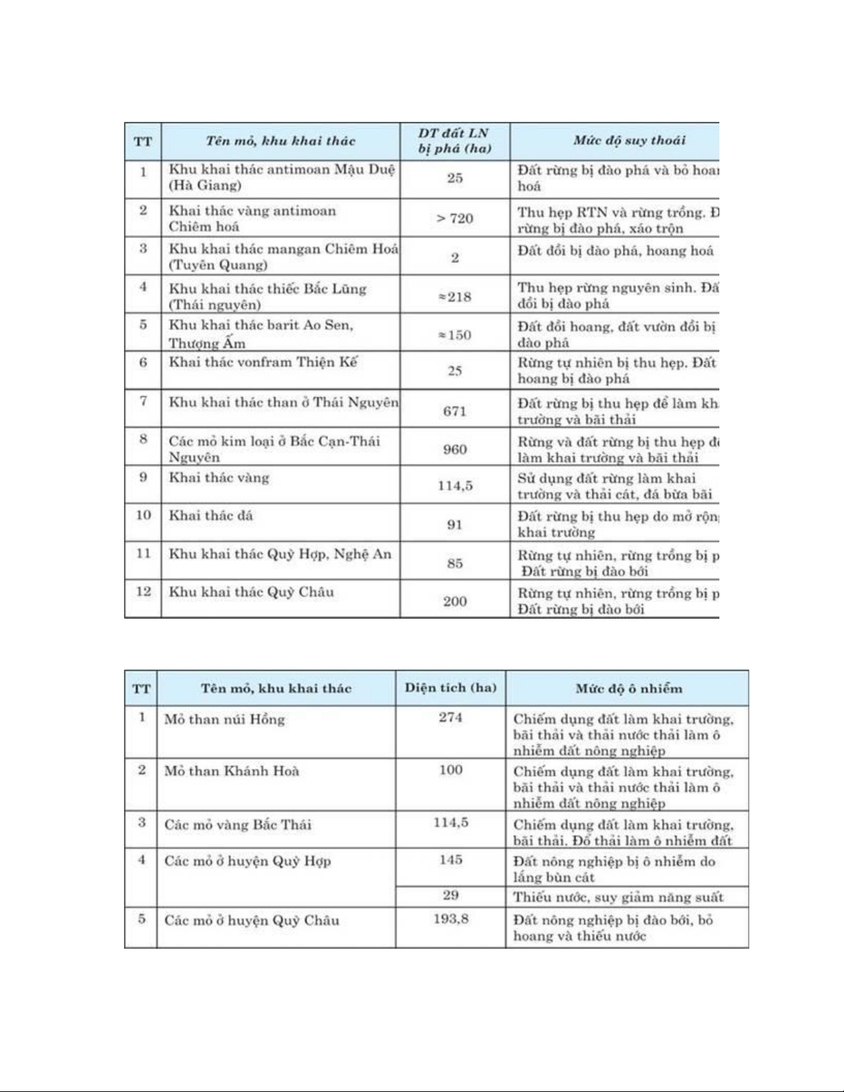 Bảng I.11. Diện tích rừng và đất rừng bị thu hẹp, thoái hoá ở một số mỏ