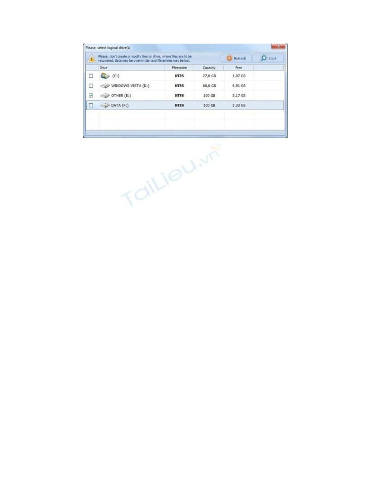 Đánh dấu để chọn 1 phân vùng ổ đĩa, rồi nhấn nút Start ở góc trên bên phải.