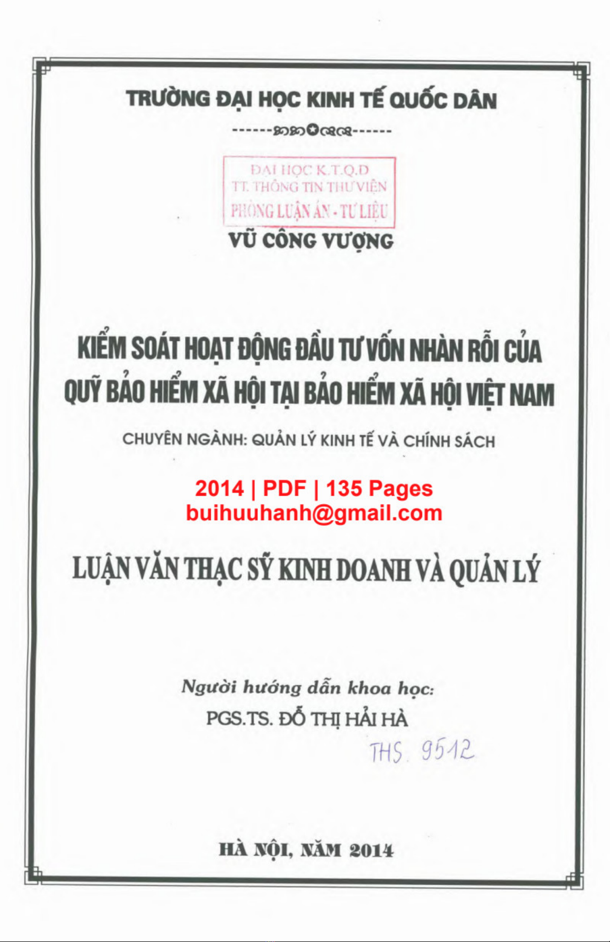 Lựa văn Thạc sĩ Kinh doanh và quản lý: 'Kiểm soát hoạt động đầu tư vốn nhàn rỗi của Quỹ Bảo hiểm xã hội tại Bảo hiểm xã hội Việt Nam' là một nghiên cứu chỉ trích về việc kiểm soát hoạt động đầu tư vốn nhàn rỗi của Quỹ Bảo hiểm xã hội Việt Nam giai đoạn 2010-2014. Nghiên cứu này phân tích yếu tố ảnh hưởng đến hiệu quả kiểm soát, bao gồm cơ sở lý luận, chính sách và quy định hiện hành, thực trạng đầu tư và sử dụng vốn nhàn rỗi của Quỹ Bảo hiểm xã hội Việt Nam. Thông qua phân tích yếu tố này, đến xuất khẩu các mẫu hình thức kiểm soát hoạt động đầu tư vốn nhàn rỗi, nghiên cứu này cho thấy rằng để hoàn thiện kiểm soát hoạt động đầu tư vốn nhàn rỗi, Quỹ Bảo hiểm xã hội Việt Nam cần phát triển hệ thống quản lý rủi ro, tăng cường công tác giám sát và đánh giá hiệu quả, cũng như cải thiện cơ sở pháp lý và chính sách hiện hành. Nghiên cứu này từ đó cho ra một số gợi ý và giải pháp có thể áp dụng cho các tổ chức bảo hiểm khác trong tương lai.