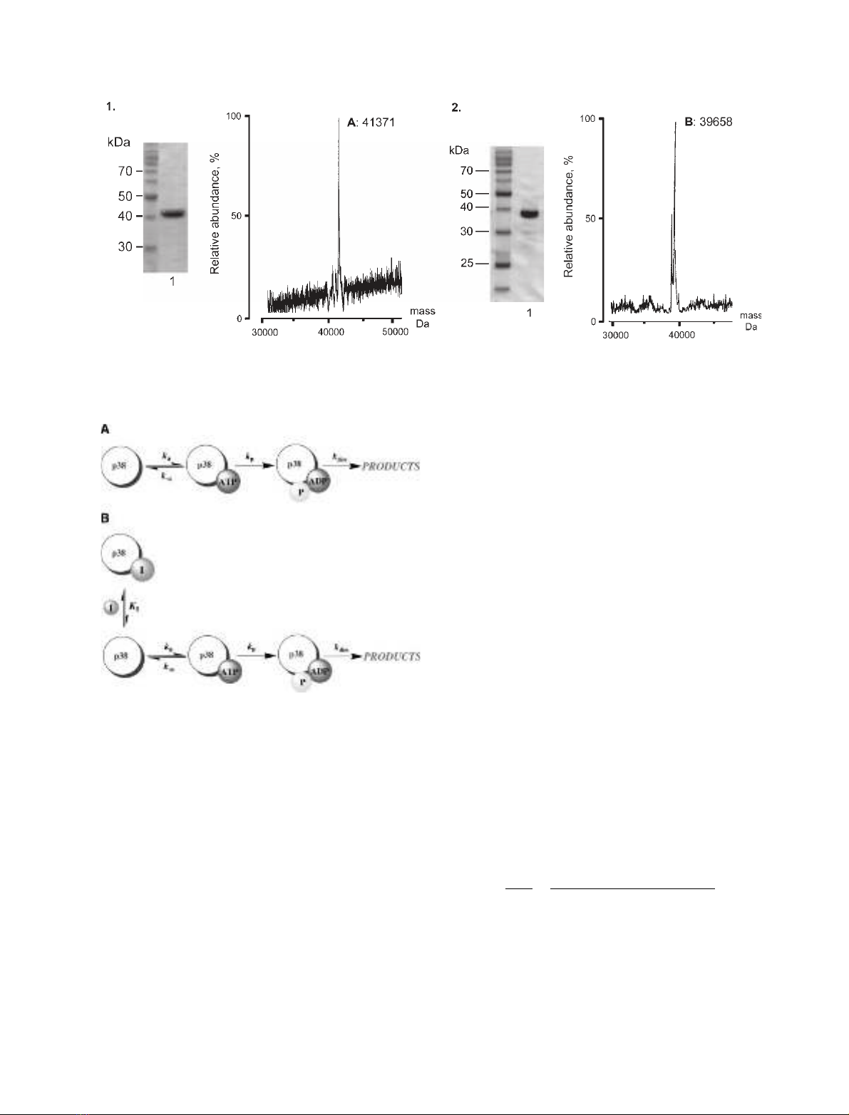 Fig. 1. Preparation of activated p38 MAPKaand ATF2D115. (A) 10% SDS ⁄PAGE analysis showing activated, p38 MAPKa(lane 1) and its MS