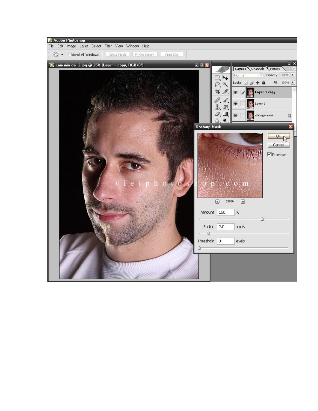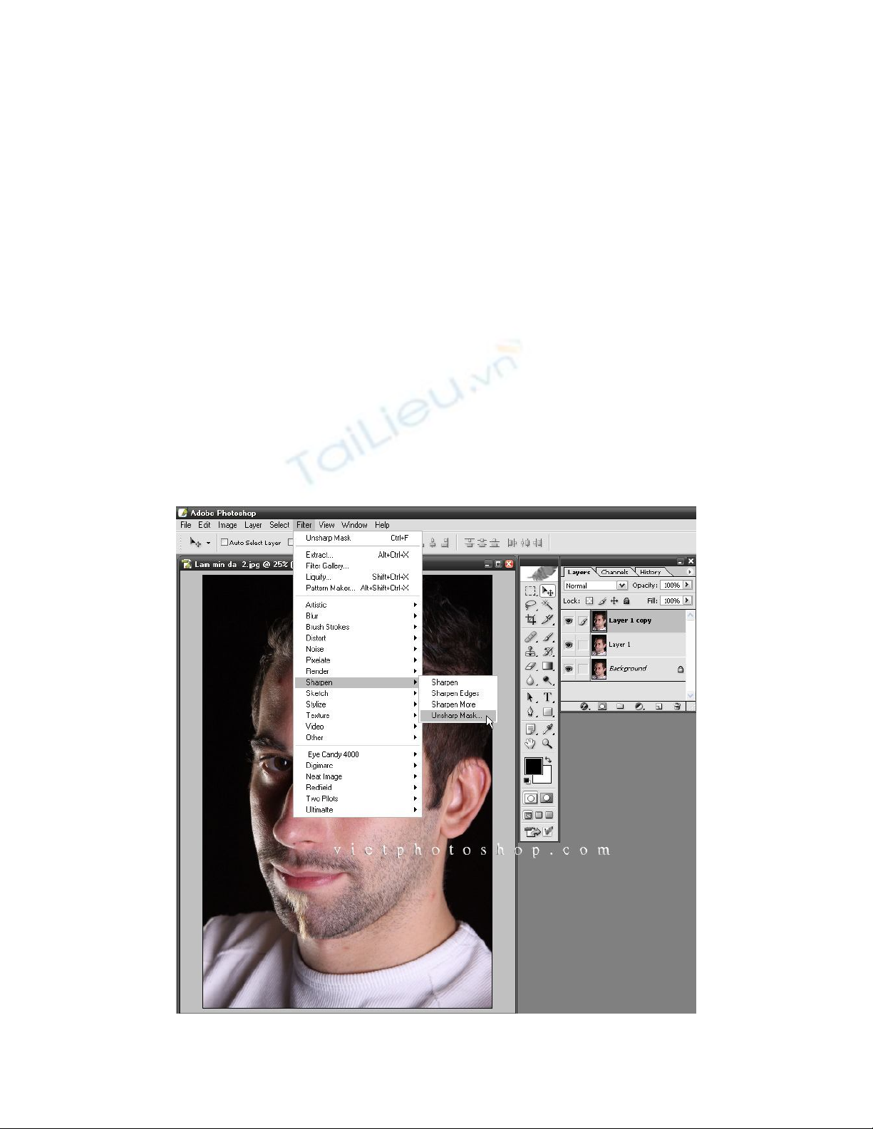 2- Vào Filter/Sharpen/Unsharp Mask... để mở Bảng USM.