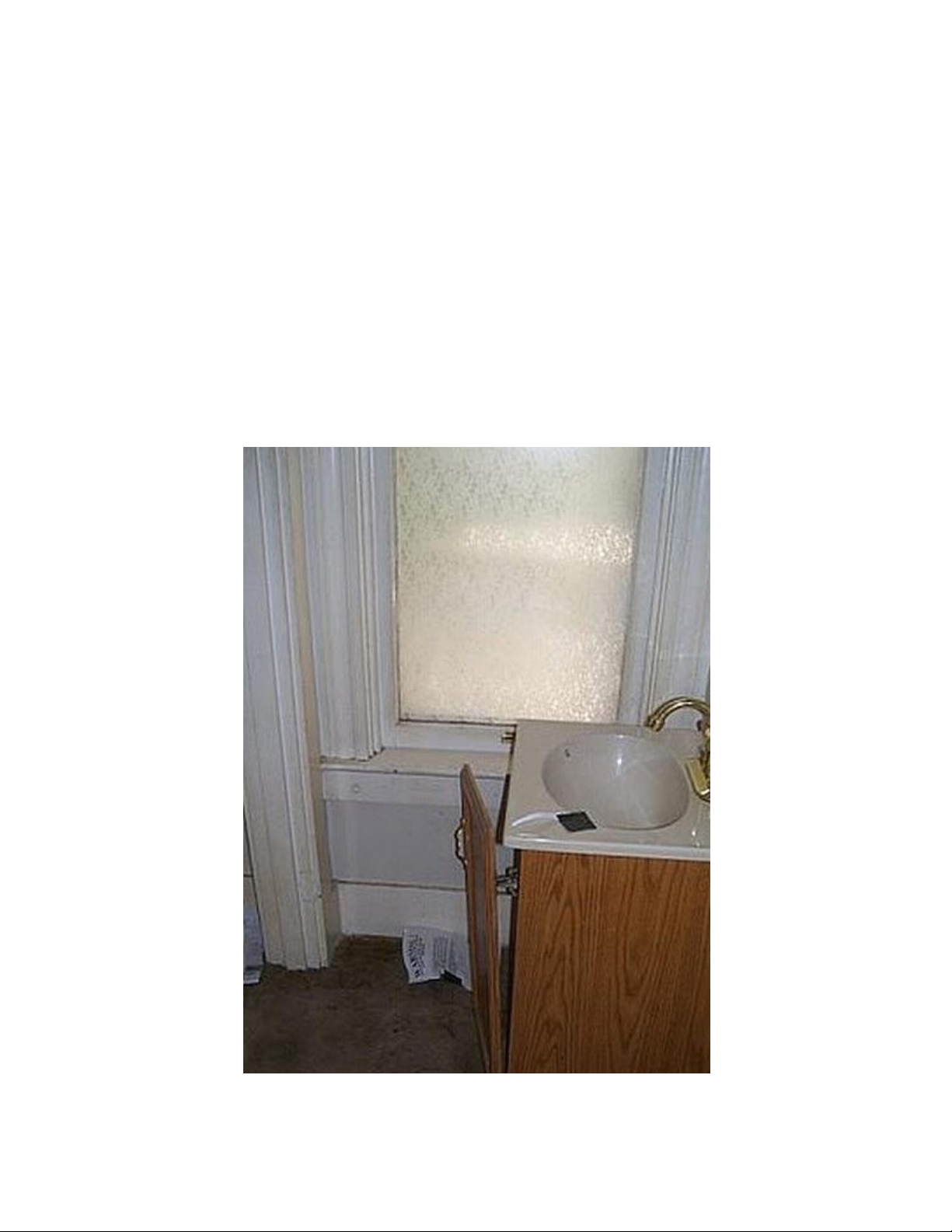 màu, tủ dưới bồn bong tróc, hỏng cánh. Sàn nhà màu nâu đen nhiều cặn
