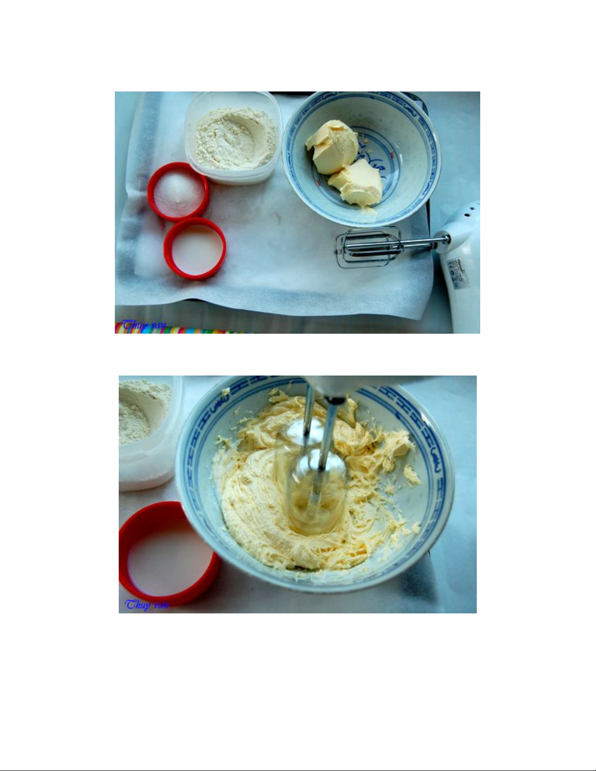 1 . Dùng máy đánh trứng, đánh bông mịn bơ và đường.