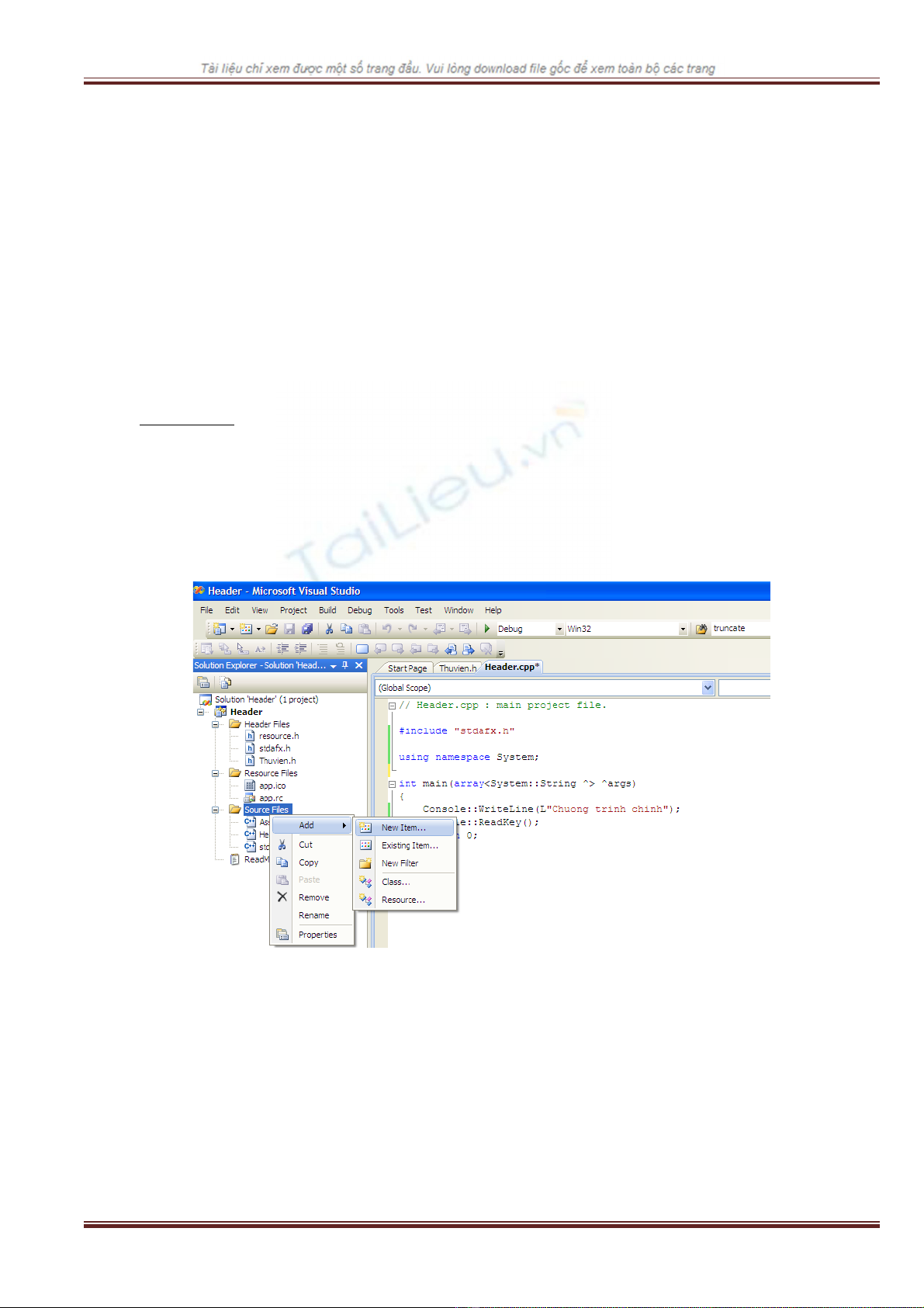 dòng Header Files và ch n Add ->New Item (trong tr ng h p mu n s d ng m t header file đã có s nọ ườ ợ ố ử ụ ộ ẵ
