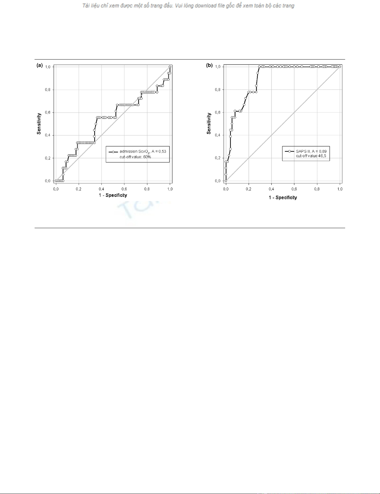 come parameter for ROC curves of (a) ScvO2 and (b) SAPS II was 28-day mortality. Area under the curve (A) values were 0.53 for ScvO2 and 0.89
