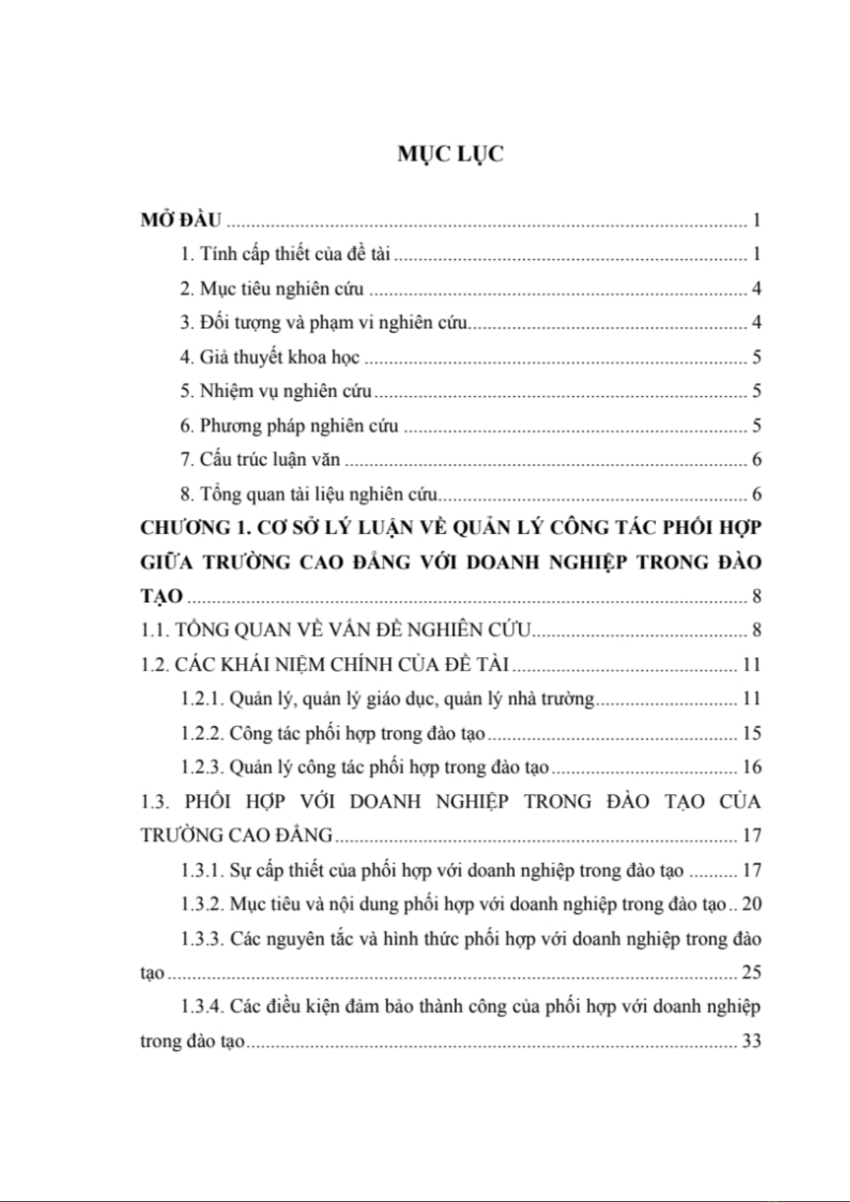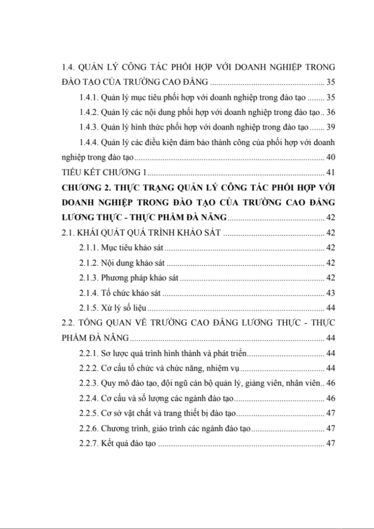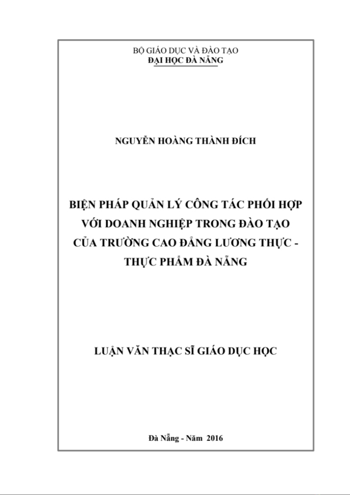 Mục tiêu của đề tài "Biện pháp quản lý công tác phối hợp với doanh nghiệp trong đào tạo của trường Cao đẳng Lương thực - Thực phẩm Đà Nẵng" đề xuất các biện pháp QL công tác phối hợp với DN trong đào tạo của trường Cao đẳng Lương thực - Thực phẩm Đà Nẵng nhằm nâng cao chất lượng và hiệu quả đào tạo.