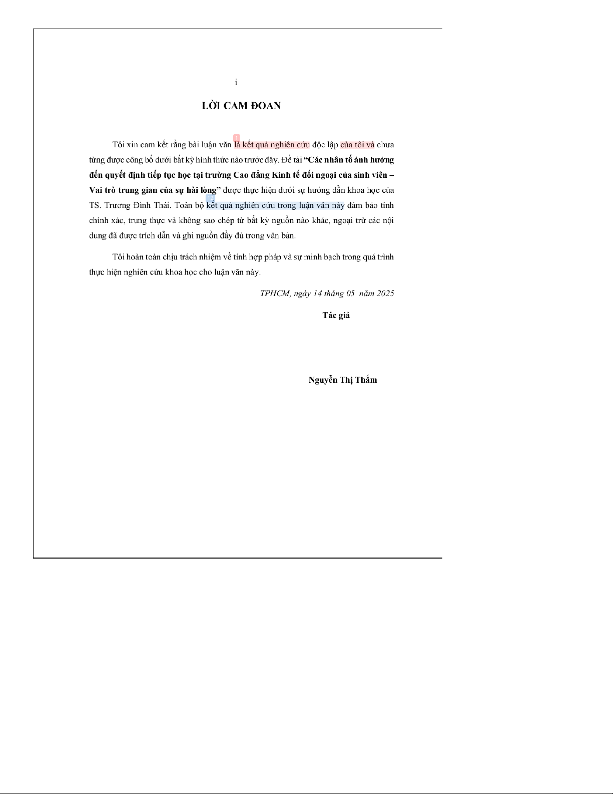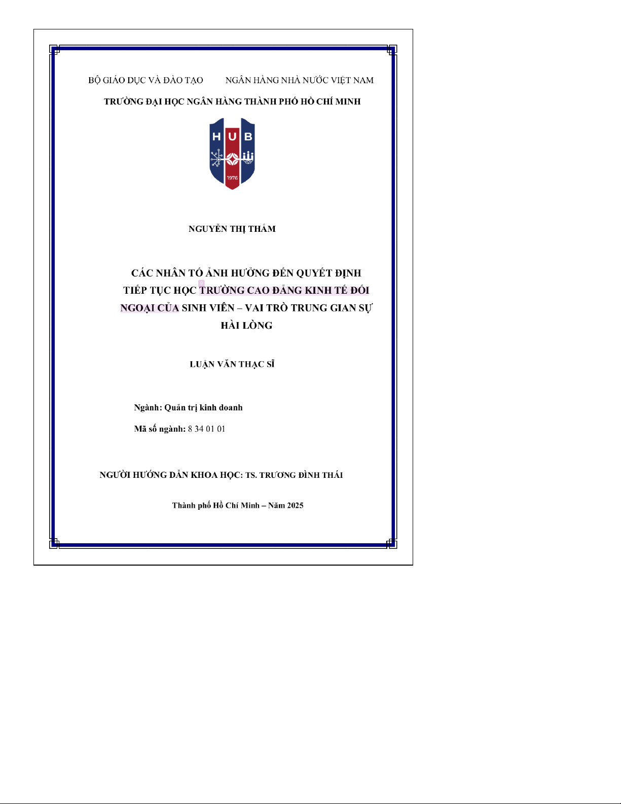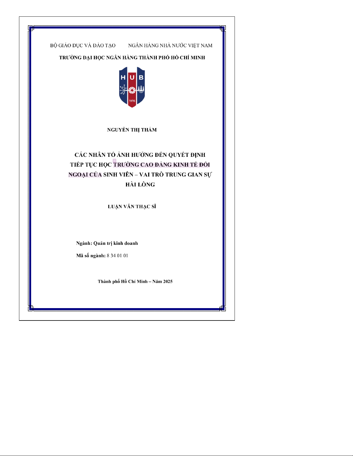 Luận văn thạc sĩ này đi sâu phân tích sự tương tác phức tạp của các nhân tố ảnh hưởng đến quyết định tiếp tục học của sinh viên tại Trường Cao đẳng Kinh tế Đối ngoại (CĐ KTĐN), đặc biệt nhấn mạnh vai trò trung gian của sự hài lòng. Nghiên cứu nhằm lấp đầy khoảng trống trong tài liệu học thuật hiện có bằng cách cung cấp phân tích cụ thể trong bối cảnh giáo dục đại học Việt Nam. Về mặt phương pháp, nghiên cứu áp dụng phương pháp hỗn hợp, chủ yếu là định lượng, bắt đầu bằng tham vấn chuyên gia để thu thập thông tin định tính và hoàn thiện công cụ khảo sát. Sau đó, mô hình nghiên cứu định lượng được phát triển và áp dụng để phân tích dữ liệu khảo sát, kiểm định các giả thuyết về các nhân tố đã xác định và vai trò trung tâm của sự hài lòng của sinh viên. Kết quả cho thấy các yếu tố như đặc điểm của trường, cơ hội nghề nghiệp, mức độ tương thích cá nhân của sinh viên và ảnh hưởng xã hội đều tác động đáng kể đến quyết định tiếp tục học của họ. Đáng chú ý, sự hài lòng của sinh viên đóng vai trò trung gian mạnh mẽ, củng cố mối liên hệ giữa các nhân tố ảnh hưởng này và cam kết gắn bó của sinh viên với trường. Nghiên cứu này đóng góp lý thuyết quan trọng bằng cách mở rộng hiểu biết về cơ chế duy trì sinh viên. Về mặt ứng dụng, nghiên cứu đưa ra các hàm ý quản trị thiết thực cho CĐ KTĐN, giúp trường nâng cao chất lượng chương trình đào tạo, cải thiện chất lượng dịch vụ, tối ưu hóa truyền thông marketing và xây dựng chiến lược thu hút, giữ chân sinh viên hiệu quả hơn, từ đó góp phần vào sự phát triển bền vững của trường.