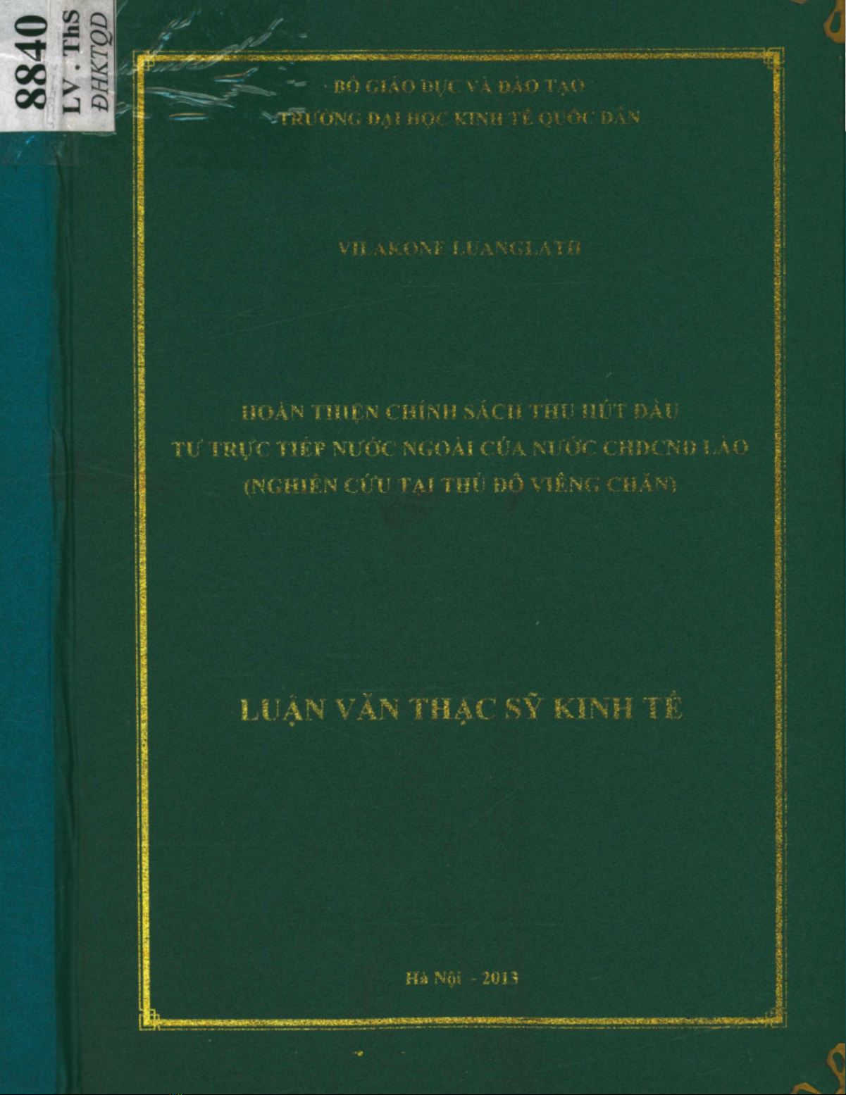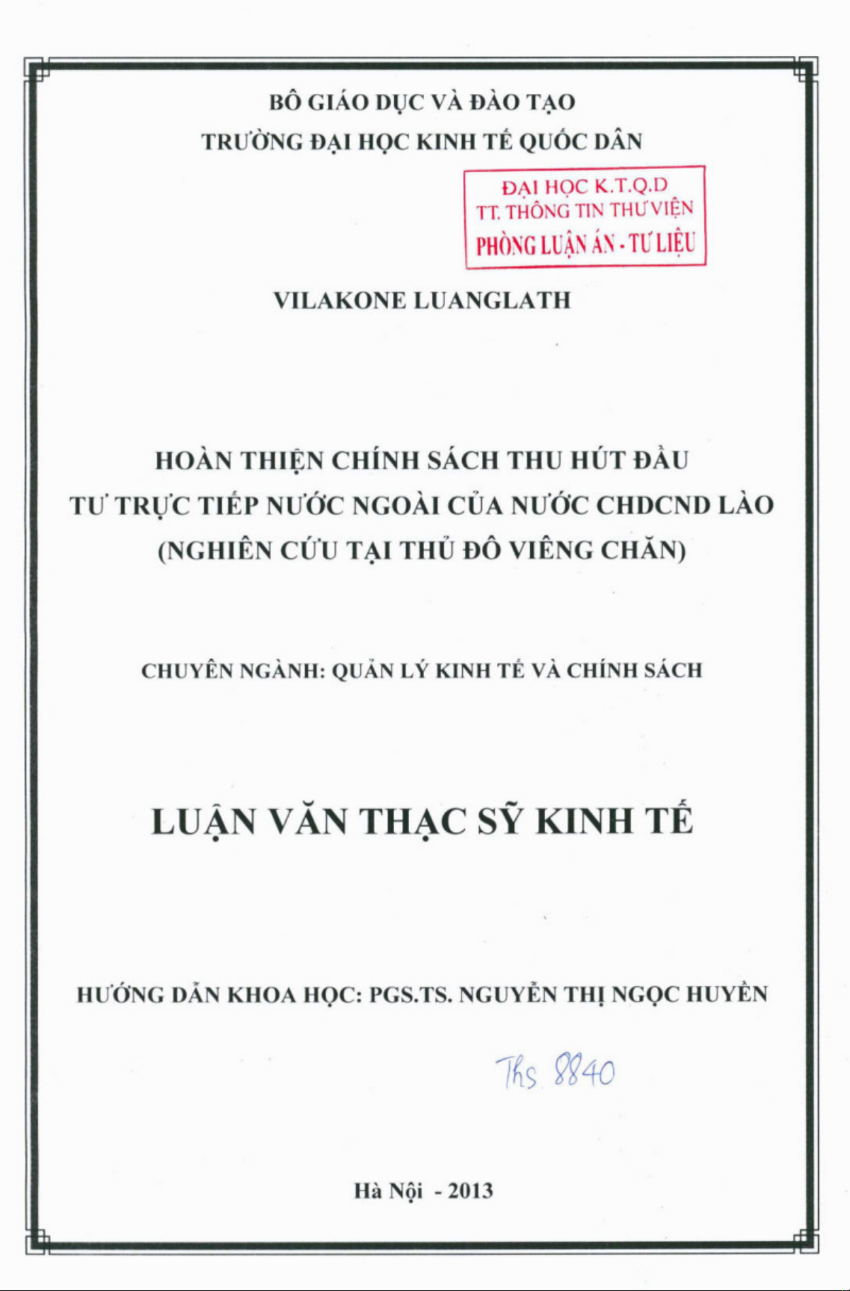 Luận văn Thạc sĩ Kinh doanh và quản lý: Hoàn thiện chính sách thu hút đầu tư trực tiếp nước ngoài của CHDCND Lào (nghiên cứu tại thủ đô Viêng Chăn) là một nghiên cứu về việc hoàn thiện chính sách thu hút đầu tư trực tiếp từ các nước ngoài đối với CHDCND Lào, với mục tiêu chính là phát triển kinh tế và hội nhập quốc tế. Luận văn trình bày các sự hạn chế hiện có trong chính sách thu hút đầu tư, cũng như giải pháp để khắc phục chúng.
