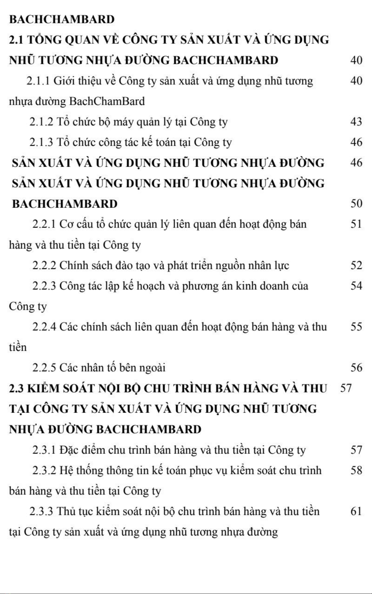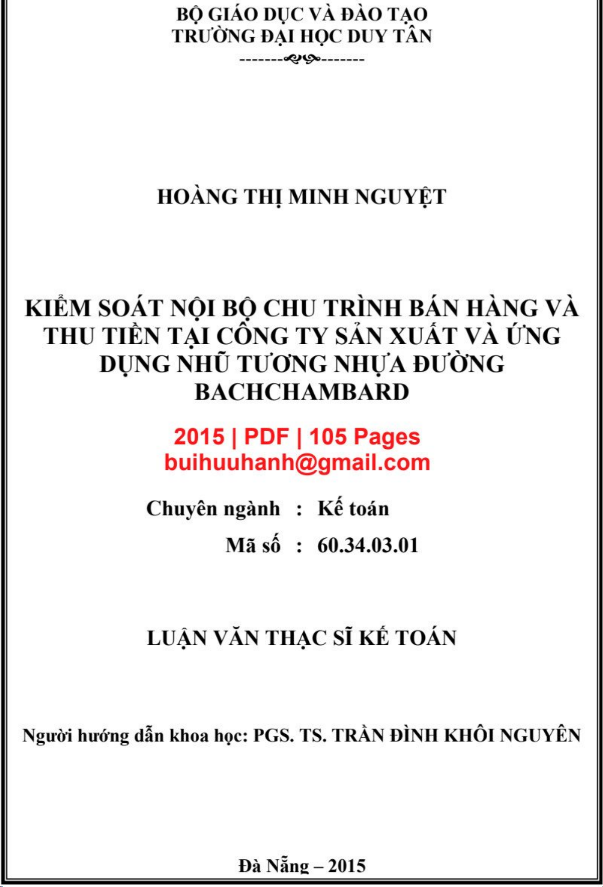 Luận văn Thạc sĩ Kế toán 'Kiểm soát nội bộ chu trình bán hàng và thu tiền tại Công ty Sản xuất và ứng dụng nhũ tương nhựa đường Bachchambard' là một nghiên cứu về kiểm soát nội bộ chu trình bán hàng và thu tiền trong doanh nghiệp, đưa ra các giải pháp tăng cường kiểm soát nội bộ cho Công ty Sản xuất và ứng dụng nhũ tương nhựa đường BachChamBard. Nghiên cứu này sử dụng các phương pháp khoa học để đánh giá hiệu quả kiểm soát nội bộ tại doanh nghiệp và có thể giúp các doanh nghiệp trong ngành sản xuất và ứng dụng nhũ tương nhựa đường cải thiện hiệu quả kinh doanh.