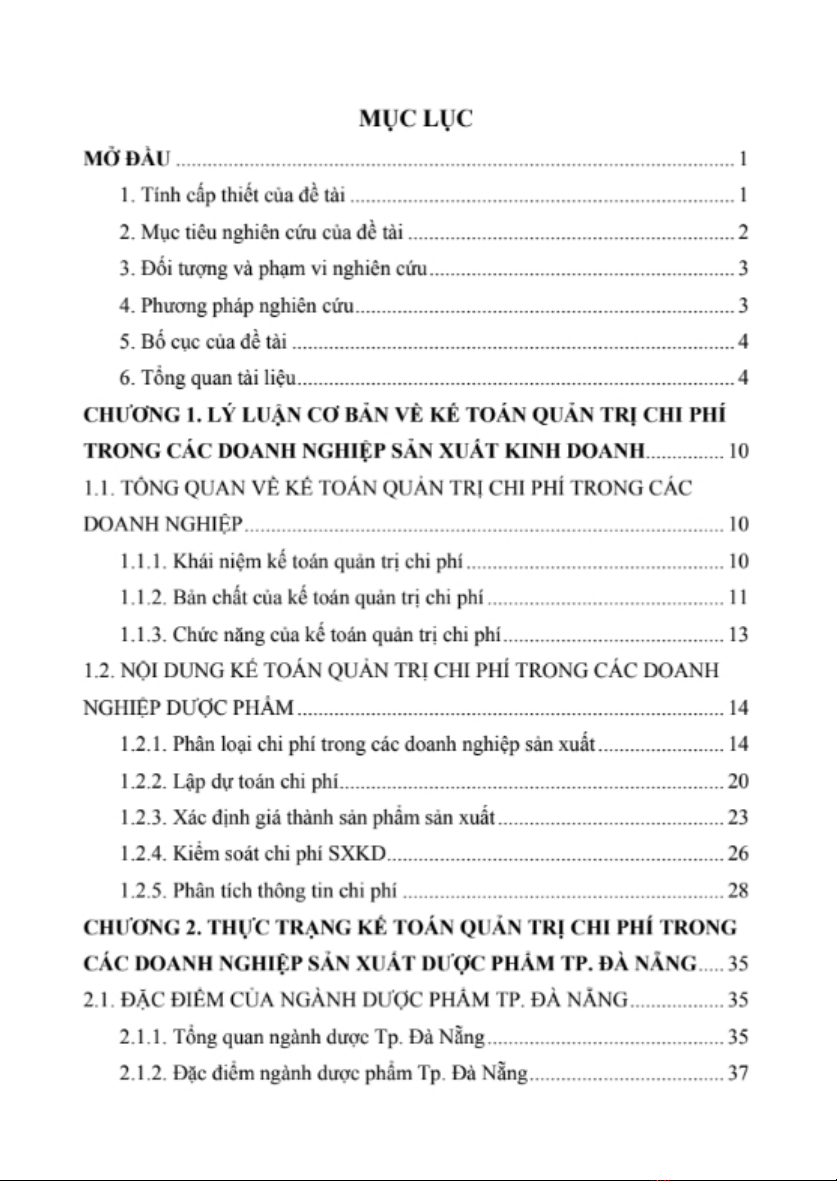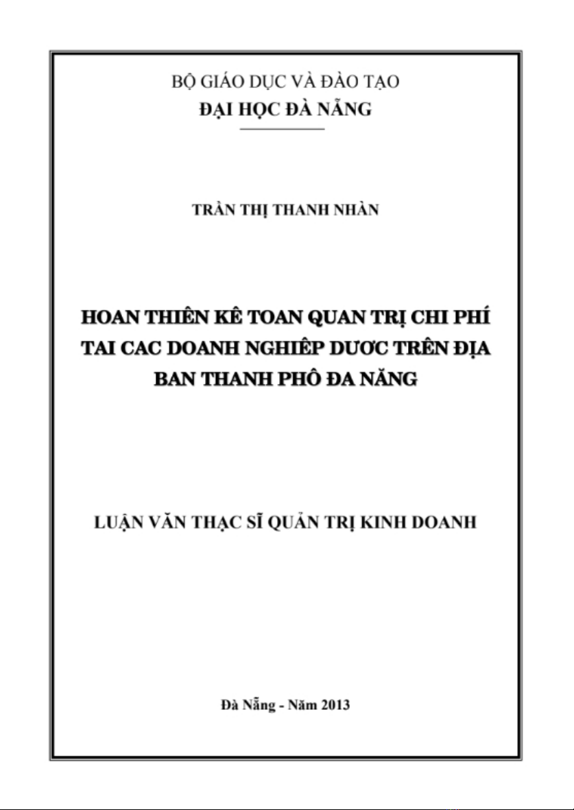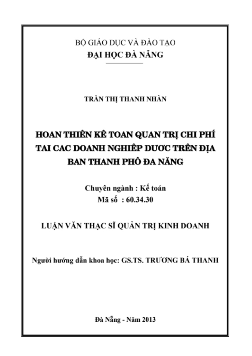 Mục tiêu của đề tài "Hoàn thiện kế toán quản trị chi phí tại các doanh nghiệp dược trên địa bàn thành phố Đà Nẵng" là hệ thống hoá và phát triển các lý luận chung về hệ thống kế toán quản trị chi phí trong các doanh nghiệp; phân tích, đánh giá thực trạng kế toán chi phí trong các doanh nghiệp sản xuất dược phẩm tại TP. Đà Nẵng; trên cơ sở đó đưa ra những phương hướng và giải pháp hoàn thiện kế toán quản trị chi phí cho các doanh nghiệp sản xuất dược phẩm tại Đà Nẵng.