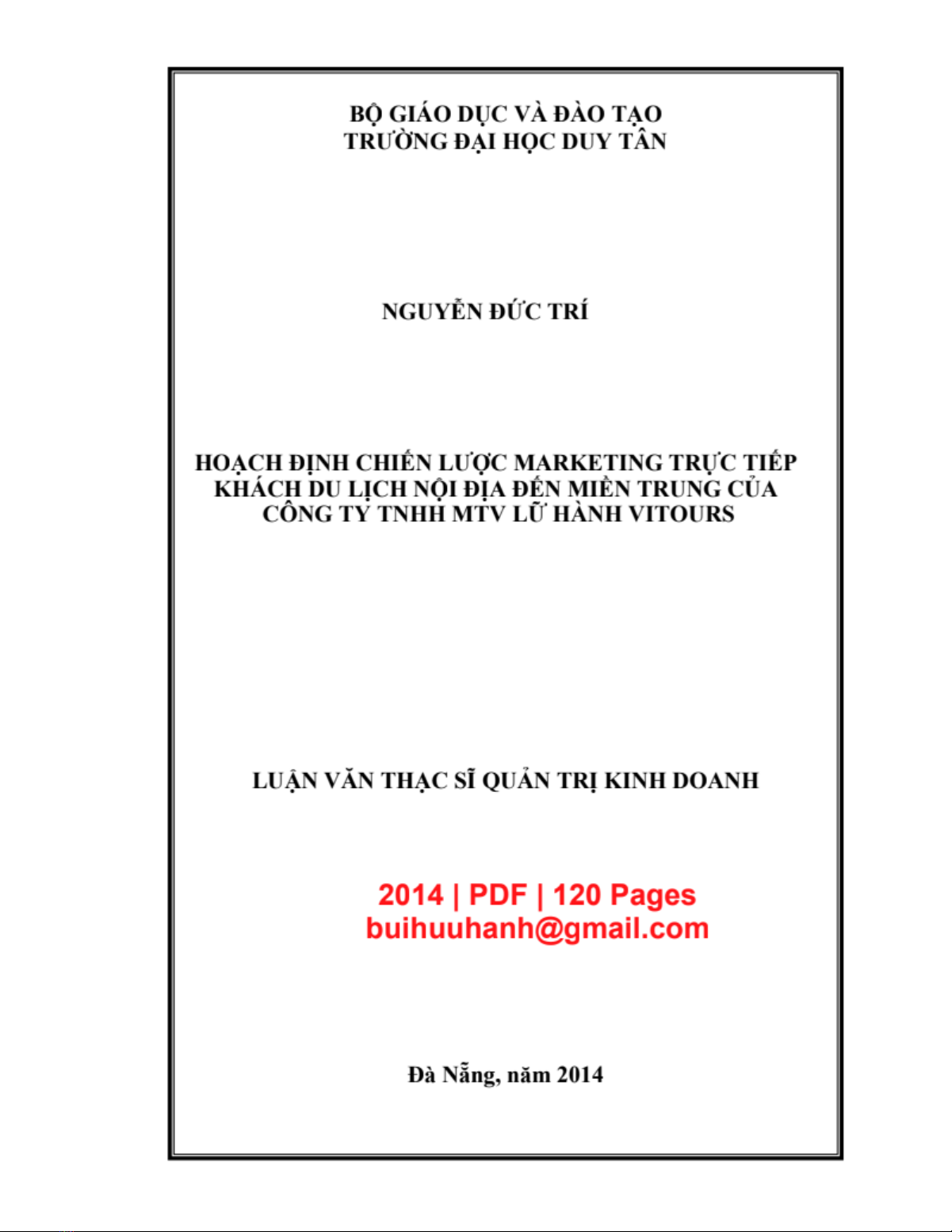 Luan van 'Hoạch định chiến lược marketing trực tiếp khách du lịch nội địa đến miền Trung của Công ty TNHH Lữ hành Vitours' là một thích hợp từ tốt thuyết luận, trong đó chú trọng vào việc phát triển chiến lược marketing trực tiếp cho thị trường khách du lịch nội địa ở miền Trung của một doanh nghiệp hành chính. Tuy nhiên, văn bản này có nội dung chính trong ba chương: Cơ sở lý luận, giới thiệu công ty và thực trạng khai thác thị trường, và xây dựng chương trình marketing. Luận văn này cung cấp các kết quả quan trọng về việc sử dụng chiến lược marketing trực tiếp để phát triển kinh doanh và mở rộng thị trường.