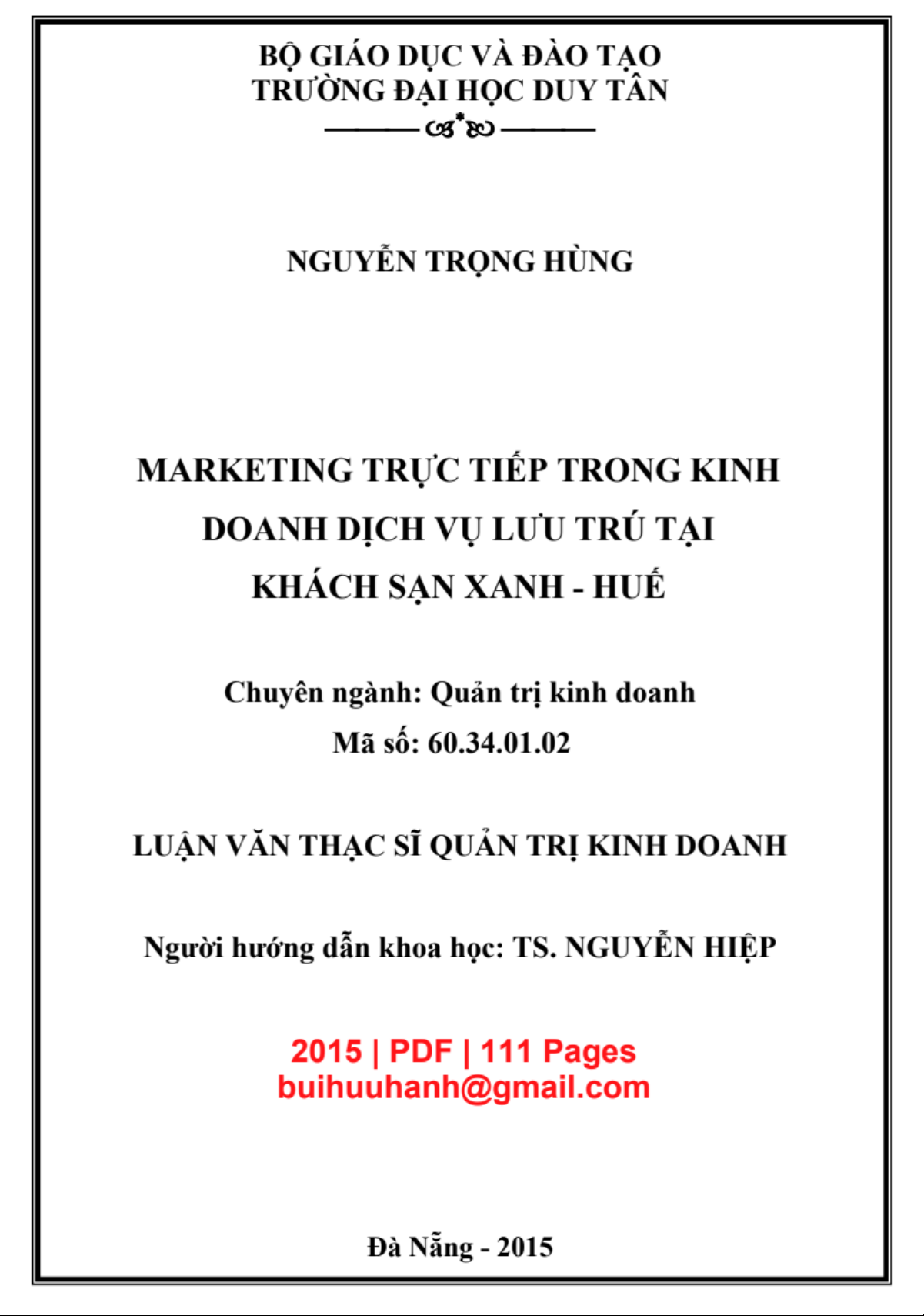 Luận văn này là một tài liệu luận văn Thạc sĩ Quản trị kinh doanh, chỉ ra vai trò quan trọng của marketing trực tiếp trong kinh doanh dịch vụ lưu trú tại khách sạn Xanh - Huế và đề xuất giải pháp hoàn thiện hoạt động marketing trực tiếp tới. Luận văn được chia thành ba chương, bao gồm lý luận về marketing trực tiếp, phân tích thực trạng marketing trực tiếp tại khách sạn Xanh - Huế và đề xuất các giải pháp cho việc phát triển chiến lược marketing trực tiếp hiệu quả.