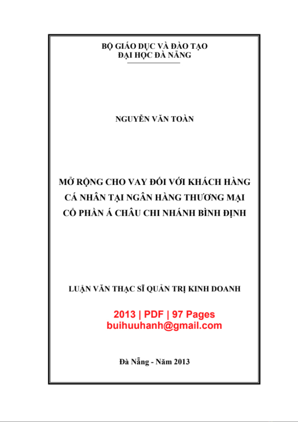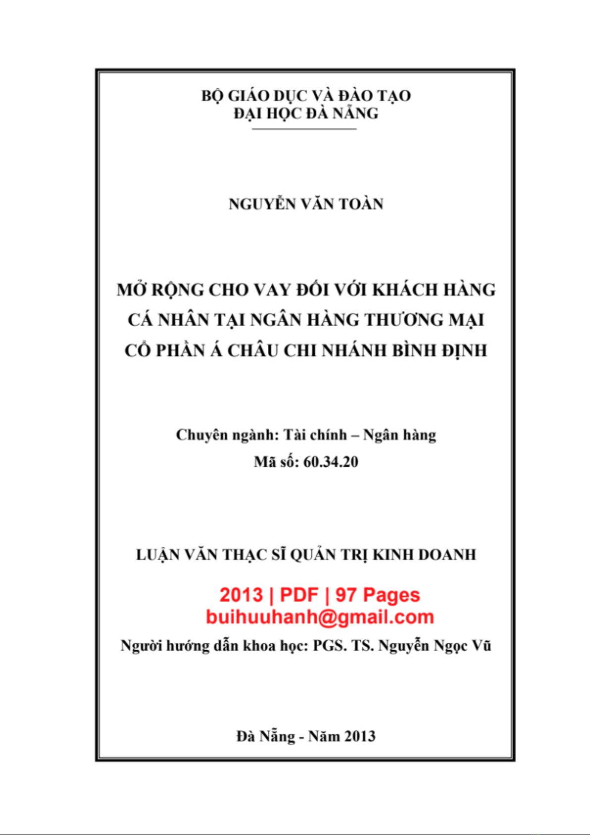 Luận văn 'Mở rộng cho vay đối với khách hàng cá nhân tại Ngân hàng thương mại cổ phần Á Châu chi nhánh Bình Định' có thể quan tâm đến các nhà luyện khoa học, doanh nghiệp của NHTM, và những người giúp việc trong Ngân hàng TMCP Á Châu.