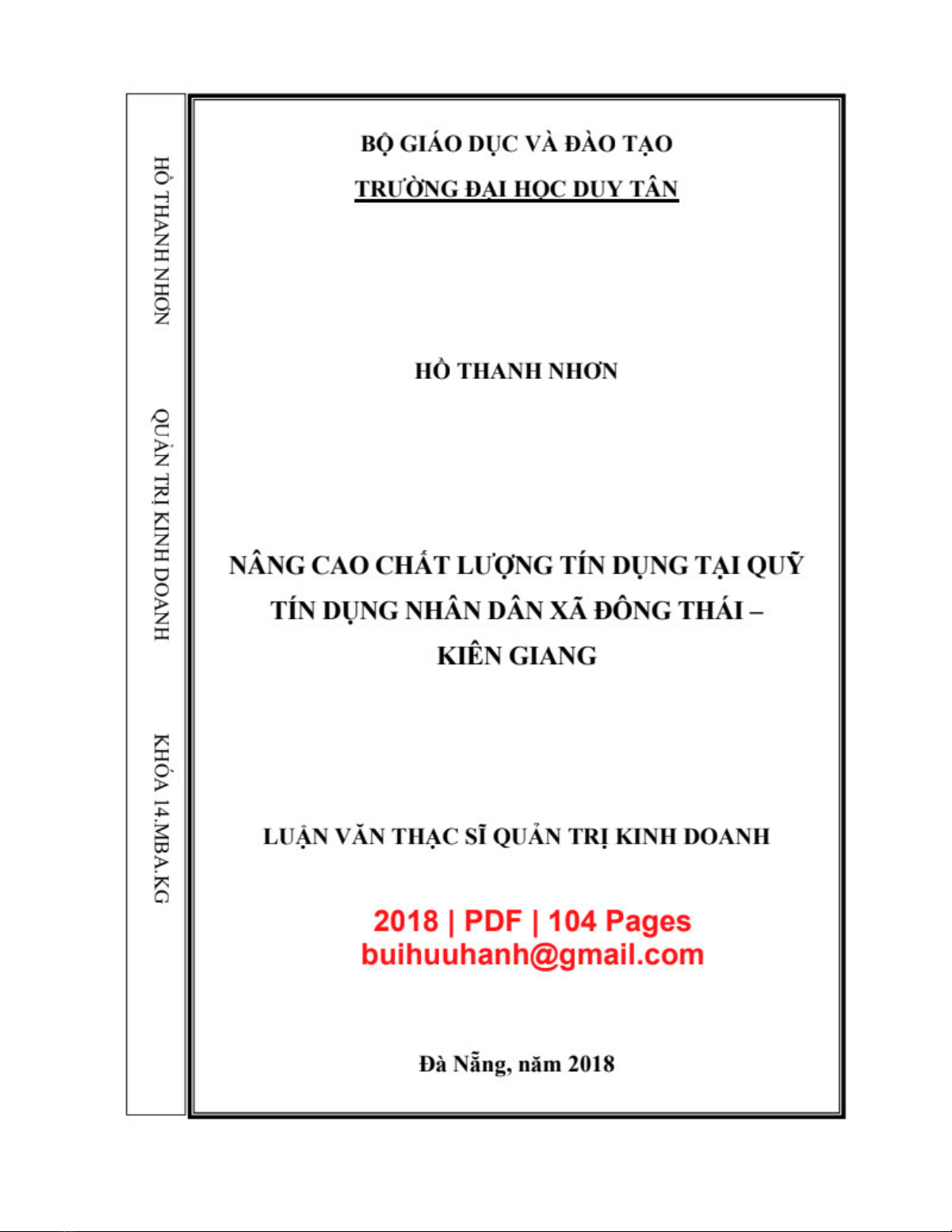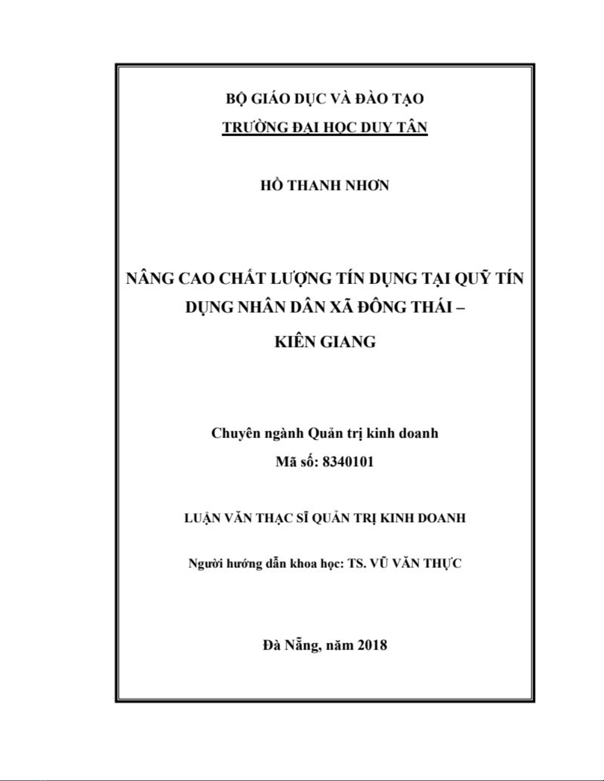 Luận văn nghiên cứu về việc nâng cao chất lượng tín dụng tại Quỹ tín dụng nhân dân xã Đông Thái - Kiên Giang, đề xuất giải pháp cần thiết để hoàn thiện hoạt động tín dụng.