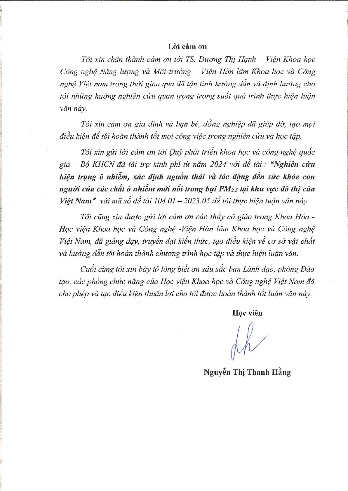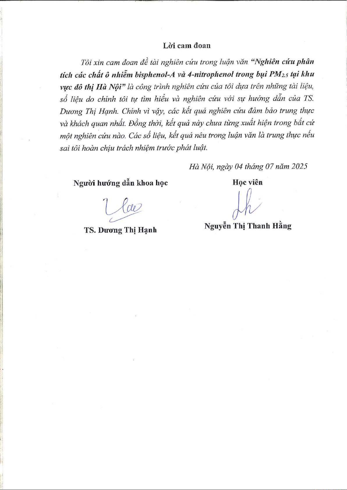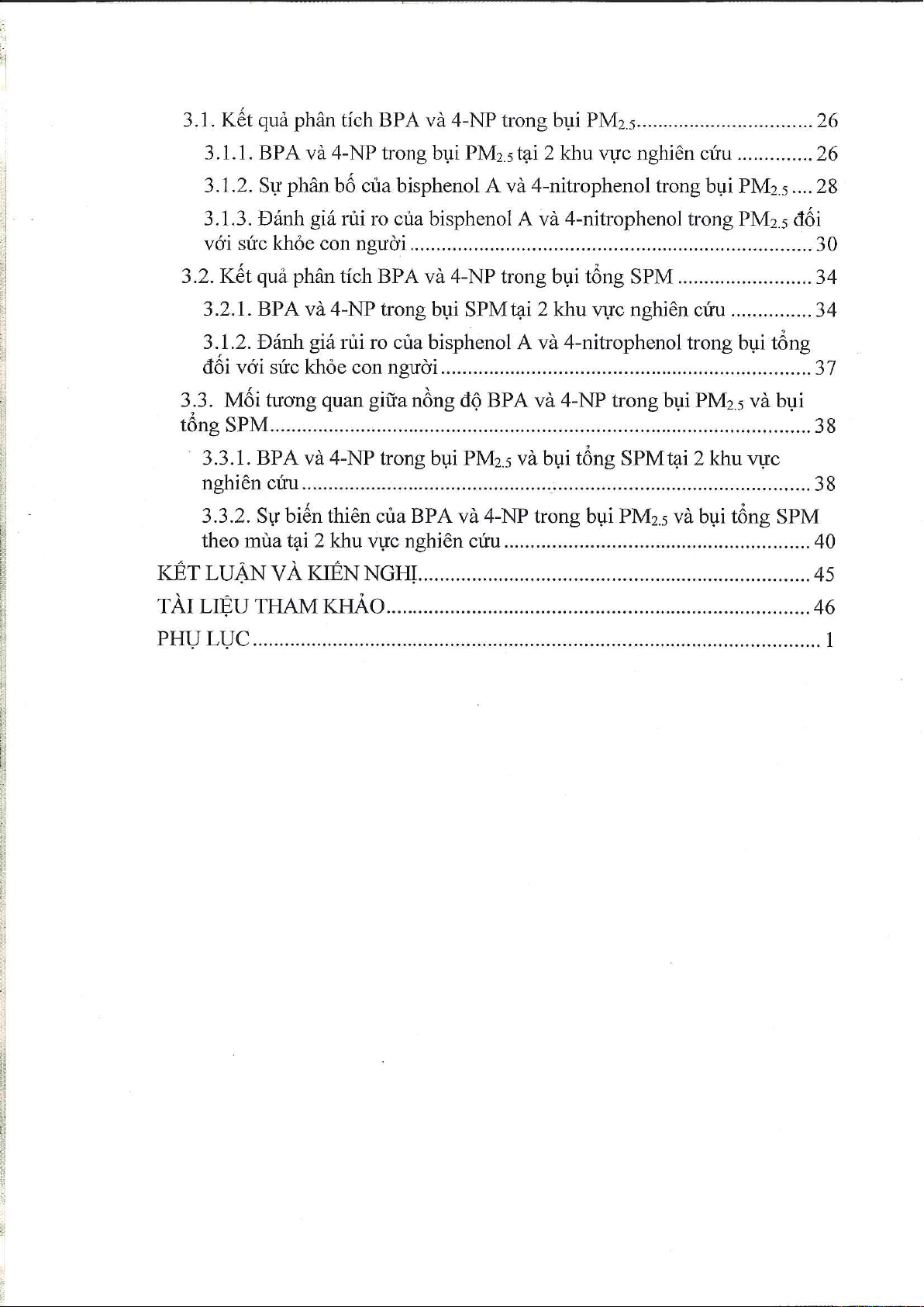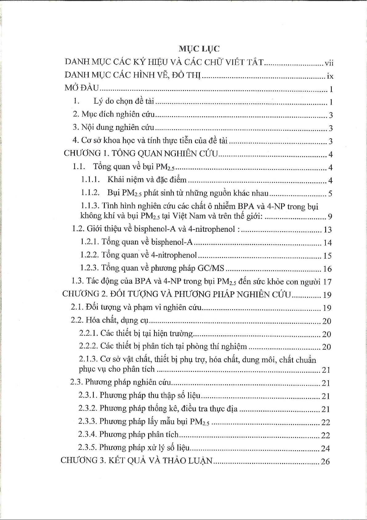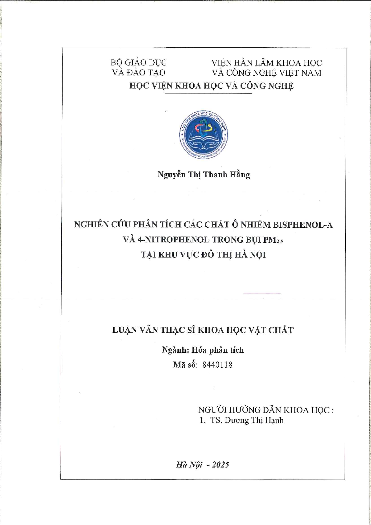 Ô nhiễm không khí, đặc biệt là bụi mịn PM2.5, đang là vấn đề môi trường cấp bách toàn cầu, gây ra nhiều hệ lụy nghiêm trọng đến sức khỏe con người, từ các bệnh về hô hấp đến tim mạch. Tại Việt Nam, quá trình đô thị hóa và phát triển kinh tế nhanh chóng đã dẫn đến tình trạng chất lượng không khí suy giảm đáng kể, với nồng độ bụi PM2.5 thường xuyên ở mức cao tại các đô thị lớn như Hà Nội. Trong bối cảnh đó, sự hiện diện của các chất ô nhiễm mới nổi như Bisphenol-A (BPA) và 4-nitrophenol (4-NP) trong bụi PM2.5 đang thu hút sự quan tâm đặc biệt do tiềm năng gây rối loạn nội tiết và các tác động tiêu cực khác đến sức khỏe. Tuy nhiên, các nghiên cứu chuyên sâu về tình trạng ô nhiễm các hợp chất này trong bụi PM2.5 tại Việt Nam còn hạn chế. Luận văn này nhằm mục đích nghiên cứu phân tích các chất ô nhiễm Bisphenol-A và 4-nitrophenol trong bụi PM2.5 tại khu vực đô thị Hà Nội, góp phần cung cấp dữ liệu khoa học cần thiết và đánh giá rủi ro tiềm ẩn đối với sức khỏe cộng đồng.
