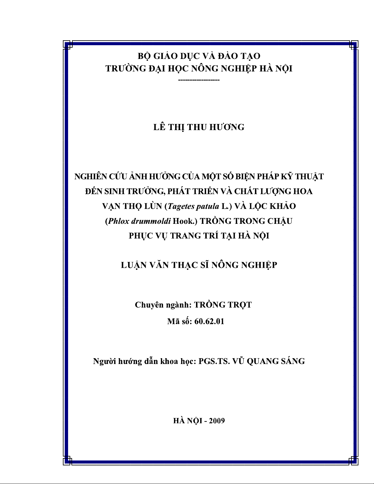 Luận văn Thạc sĩ Nông nghiệp: Nghiên cứu ảnh hưởng của một số biện pháp kỹ thuật đến sinh trưởng, phát triển và chất lượng hoa Vạn Thọ lùn lùn (Tagetes patula L.) và Lộc Khảo (Phlox drummoldi Hook.) trồng trong chậu phục vụ trang trí tại Hà Nội