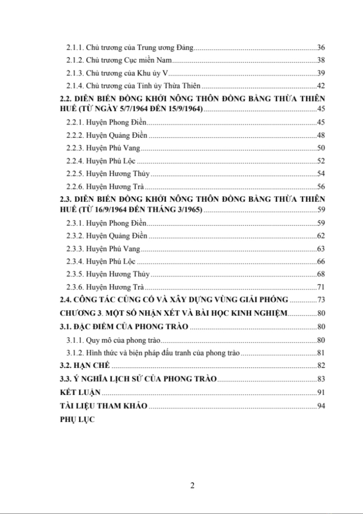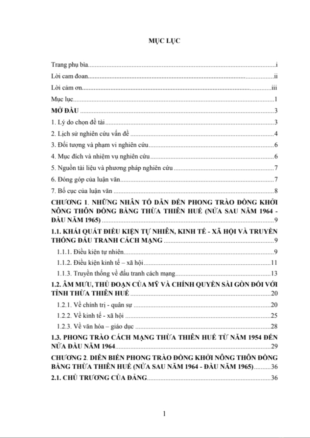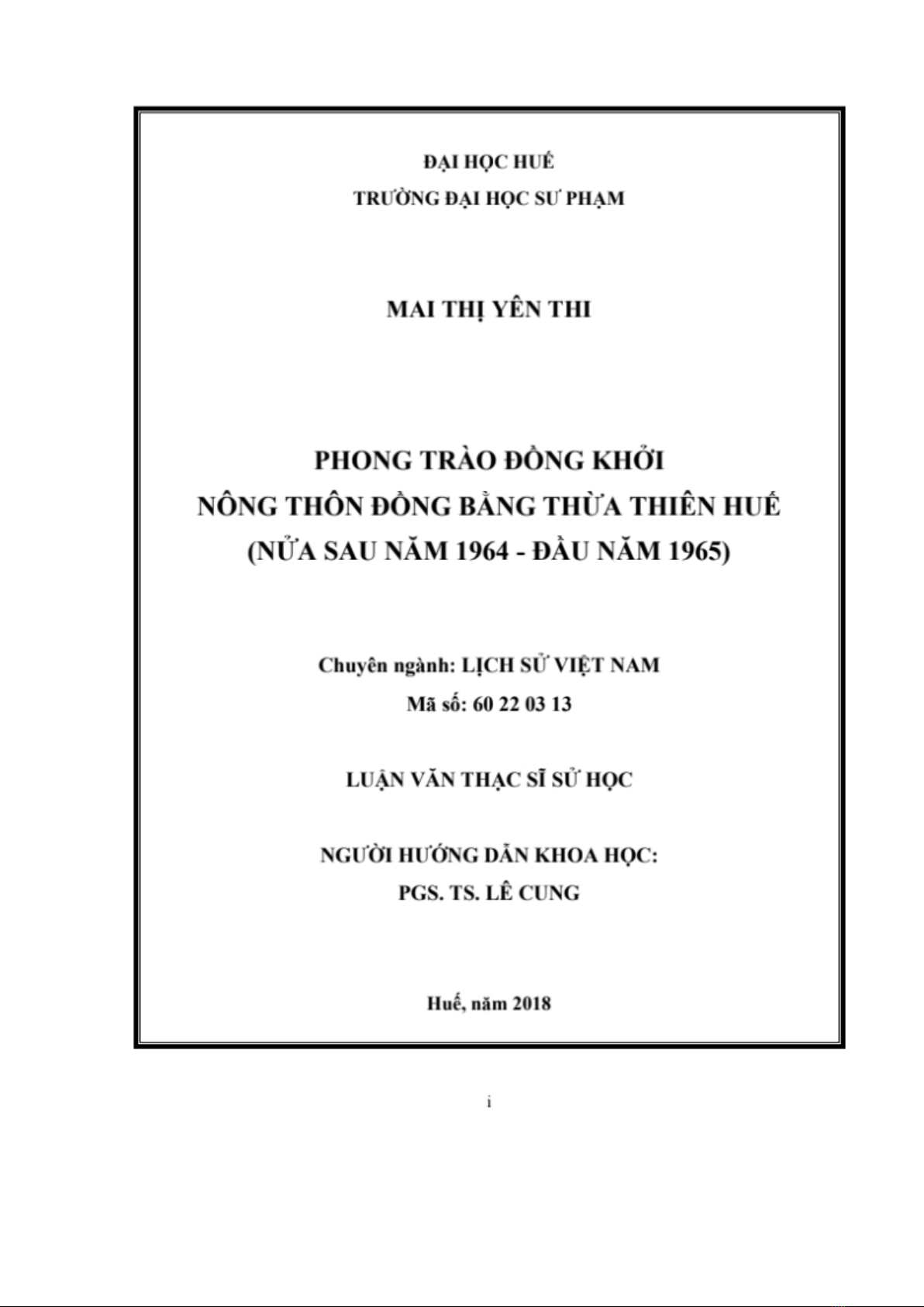 Luận văn "Phong trào Đồng Khởi nông thôn đồng bằng Thừa Thiên Huế (nửa sau năm 1964 - đầu năm 1965)" nghiên cứu nhằm khôi phục lại bức tranh về phong trào Đồng Khởi ở nông thôn đồng bằng tỉnh Thừa Thiên Huế. Qua đó làm rõ một số nét đặc thù, đồng thời khẳng định vị trí, tầm vóc của phong trào này đối với tiến trình phát triển của cuộc khách chiến chống Mỹ cứu nước ở Thừa Thiên Huế.