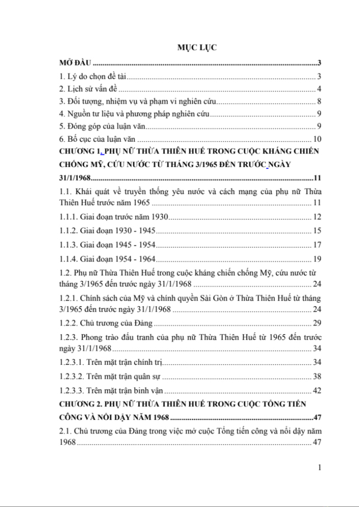Luận văn Thạc sĩ Sử học: Phụ nữ Thừa Thiên Huế trong cuộc kháng chiến chống Mỹ, cứu nước giai đoạn 1965-1968