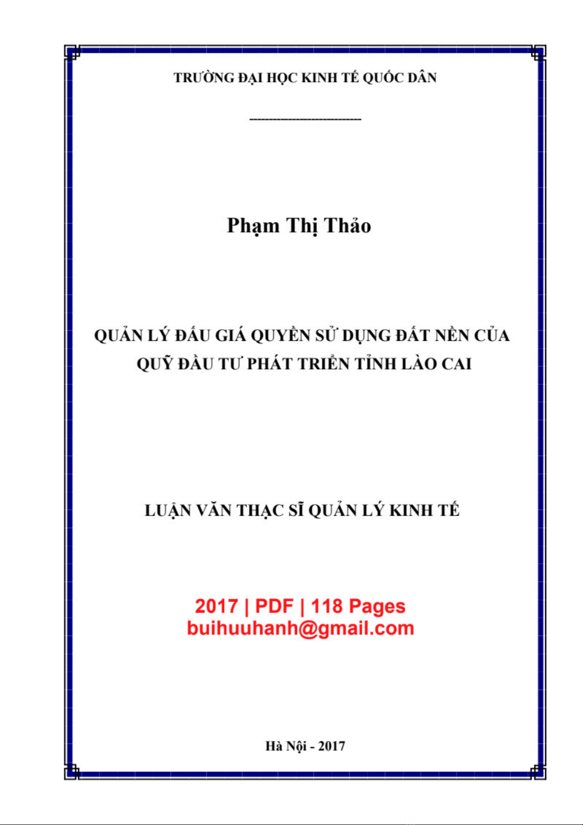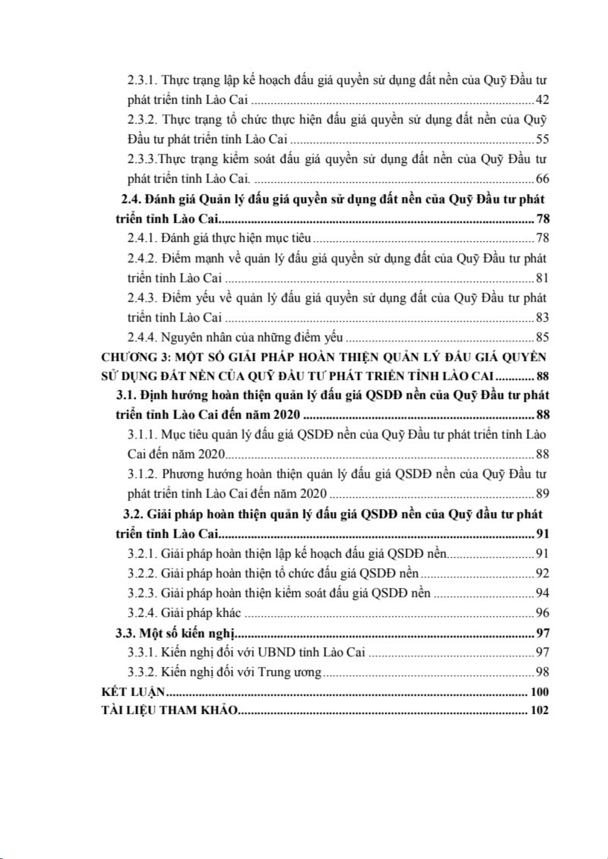 Luận văn Thạc sĩ Quản lý kinh tế 'Quản lý đấu giá quyền sử dụng đất nền của Quỹ đầu tư phát triển tỉnh Lào Cai' là một nghiên cứu về việc quản lý đấu giá quyền sử dụng đất nền của Quỹ Đầu tư phát triển địa phương. Luận văn này cho trình bày cơ sở lý luận, thực trạng và các giải pháp hoàn thiện, đánh giá hiệu quả của chính sách hiện tại, cũng như gợi ý về việc cải thiện quản lý đấu giá quyền sử dụng đất nền để phát triển kinh tế tỉnh Lào Cai.