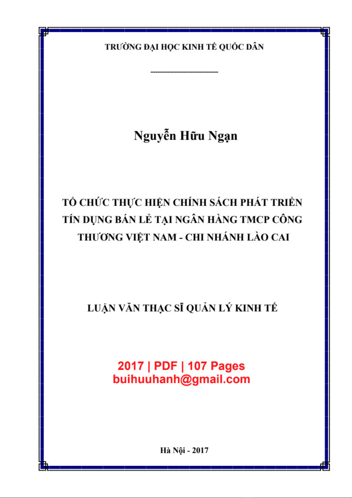 Luận văn Thạc sĩ Quản lý kinh tế nghiên cứu về việc xác định khung nghiên cứu, phân tích thực trạng, điểm mạnh và điểm yếu của chính sách phát triển tín dụng bán lẻ tại Ngân hàng TMCP Công thương Việt Nam - chi nhánh Lào Cai. Kết quả nghiên cứu cho thấy mặc dù có một số điểm mạnh như có hệ thống quản lý tín dụng hiệu quả, nhưng cũng có những điểm yếu như khó khăn trong việc tiếp cận tín dụng cho người nghèo và doanh nghiệp nhỏ. Luận văn đề xuất các giải pháp hoàn thiện tổ chức thực hiện chính sách phát triển tín dụng bán lê tại ngân hàng này đến năm 2020, bao gồm tăng cường hệ thống quản lý tín dụng, mở rộng phạm vi tiếp cận tín dụng cho người nghèo và doanh nghiệp nhỏ, và phát triển chương trình huấn luyện cho cán bộ ngân hàng.