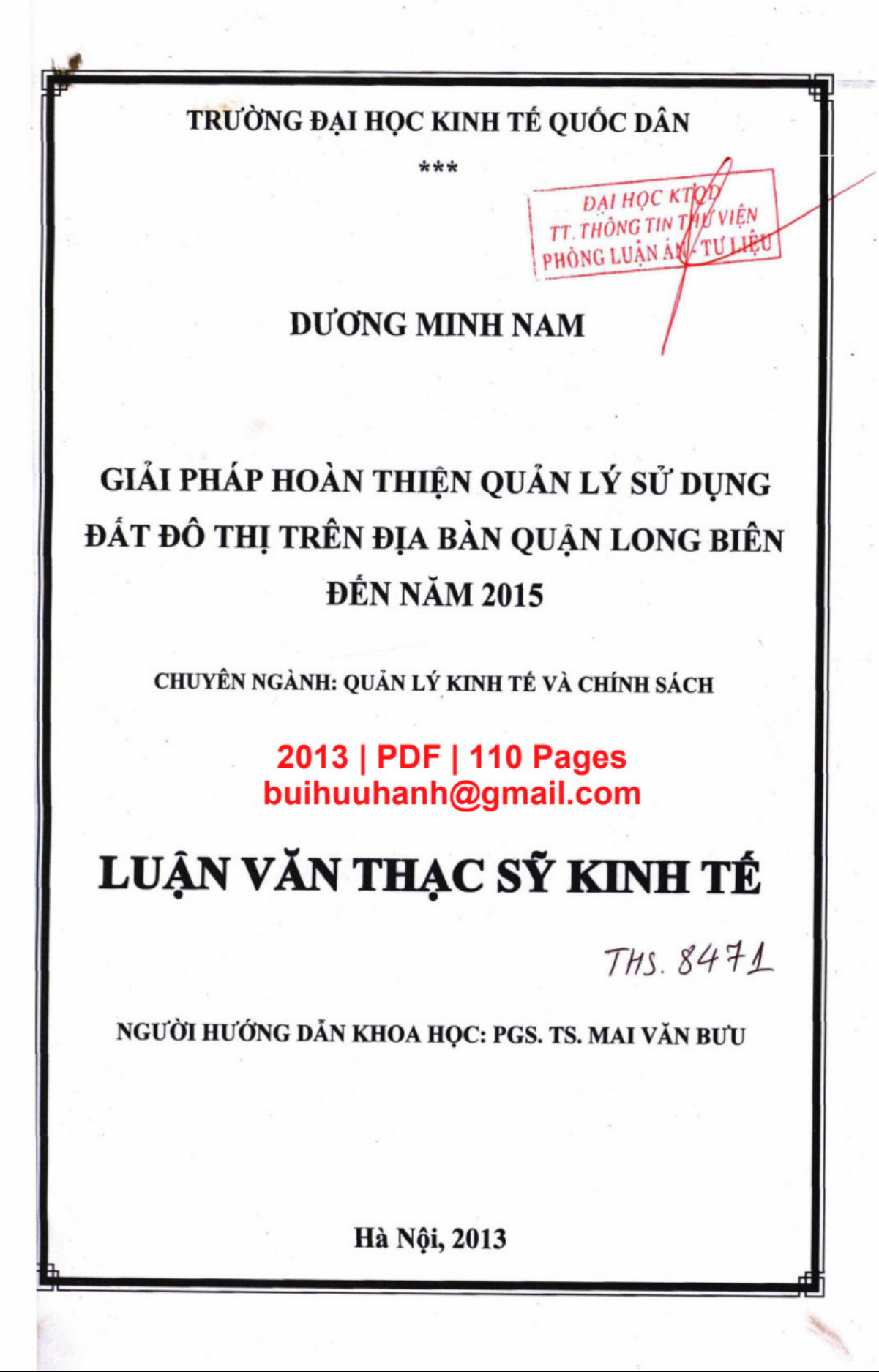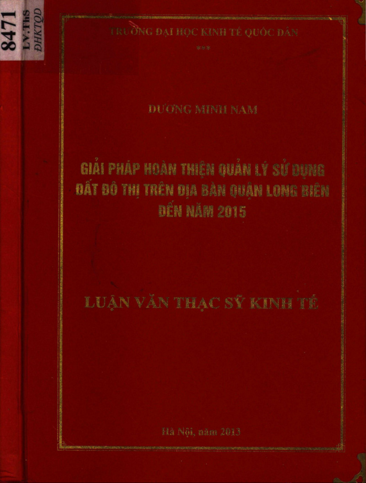 Đề tài nghiên cứu Luận văn Thạc sĩ Kinh doanh và quản lý: Giải pháo hoàn thiện quản lý sử dụng đất đô thị trên địa bàn quận Long Biên đến năm 2015 là một nghiên cứu khoa học về việc quản lý sử dụng đất đô thị tại Long Biên và Hà Nội. Luận văn này hệ thống hóa cơ sở lý luận và bài học kinh nghiệm của chính quyền Quận, phân tích thực trạng quản lý sử dụng đất đô thị trên khu vực Long Biên và Hà Nội, và đề xuất phương hướng và giải pháp hoàn thiện quản lý sử dụng đất đô thị trong năm 2015. Nghiên cứu này cung cấp những kết quả nghiên cứu về vai trò của chính quyền Quận trong việc quản lý sử dụng đất đô thị, các vấn đề và thách thức trong quá trình quản lý, cũng như những giải pháp và khuyến nghị để hoàn thiện quản lý sử dụng đất đô thị. Luận văn này có thể ý tưởng cho các chính quyền khu vực khác, cũng như cho các ngành kinh doanh và cơ quan phải tiếp tục quản lý sử dụng đất đô thị hiệu quả.