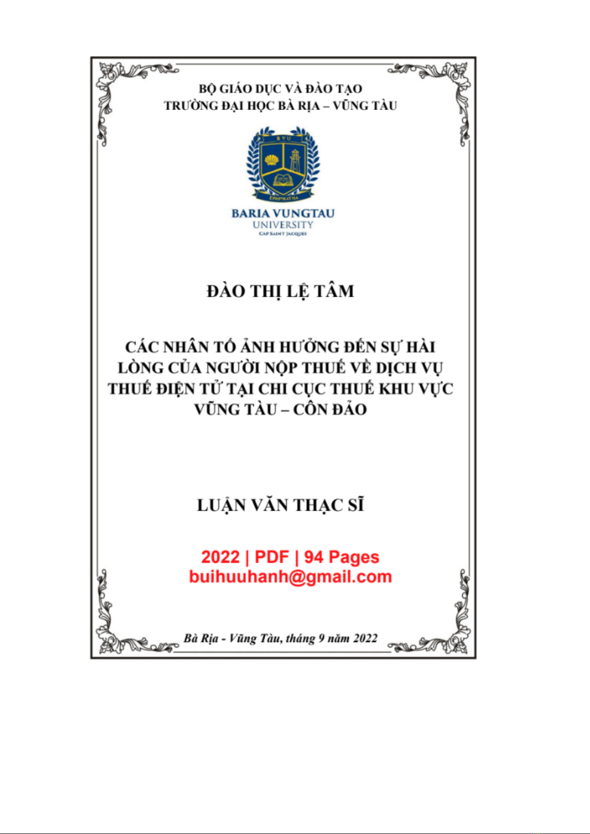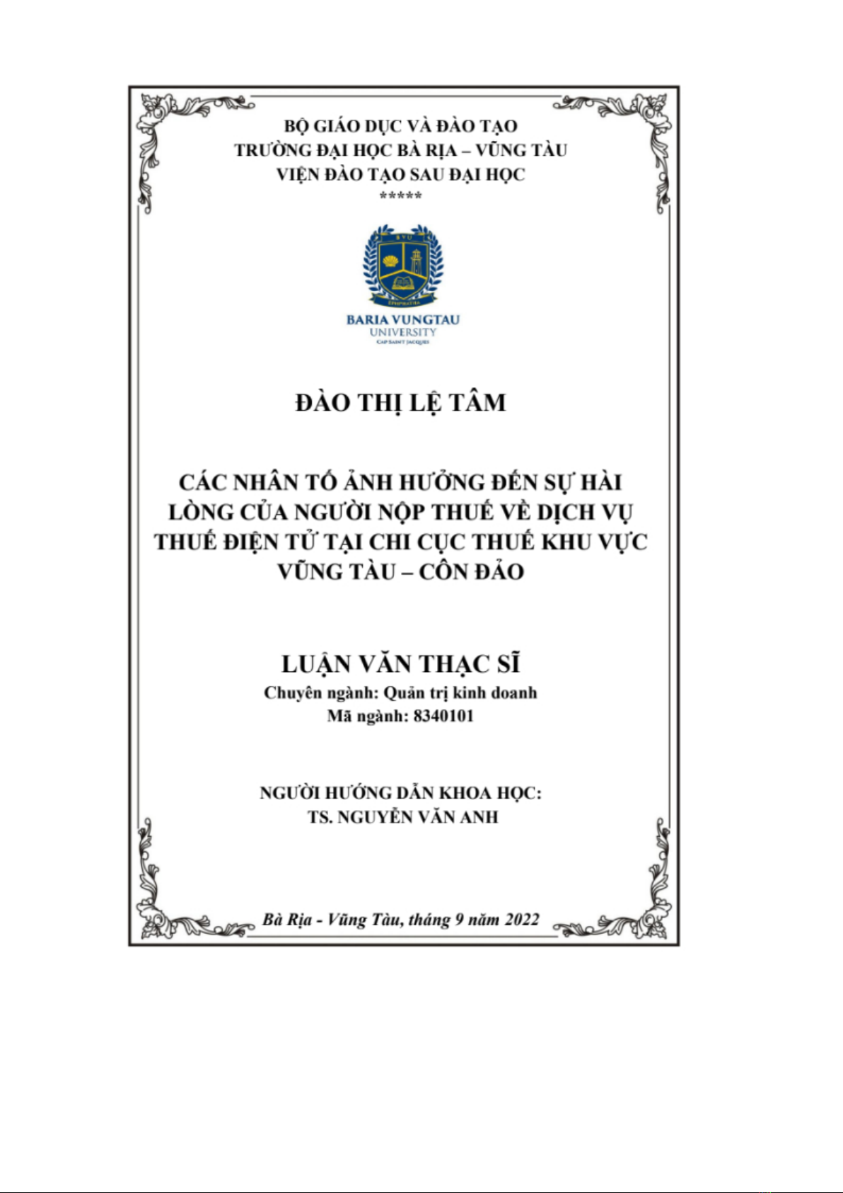 Luận văn Thạc sĩ Quản trị kinh doanh: Các nhân tố ảnh hưởng đến sự hài lòng của người nộp thuế về dịch vụ thuế điện tử tại Chi cục Thuế khu vực Vũng Tàu - Côn Đảo là một nghiên cứu khoa học về quản trị kinh doanh, mục tiêu của đề tài là xác định các yếu tố ảnh hưởng đến sự hài lòng của người nộp thuế về chất lượng dịch vụ thuế điện tử tại Chi cục Thuế khu vực Vũng Tàu - Côn Đảo.
