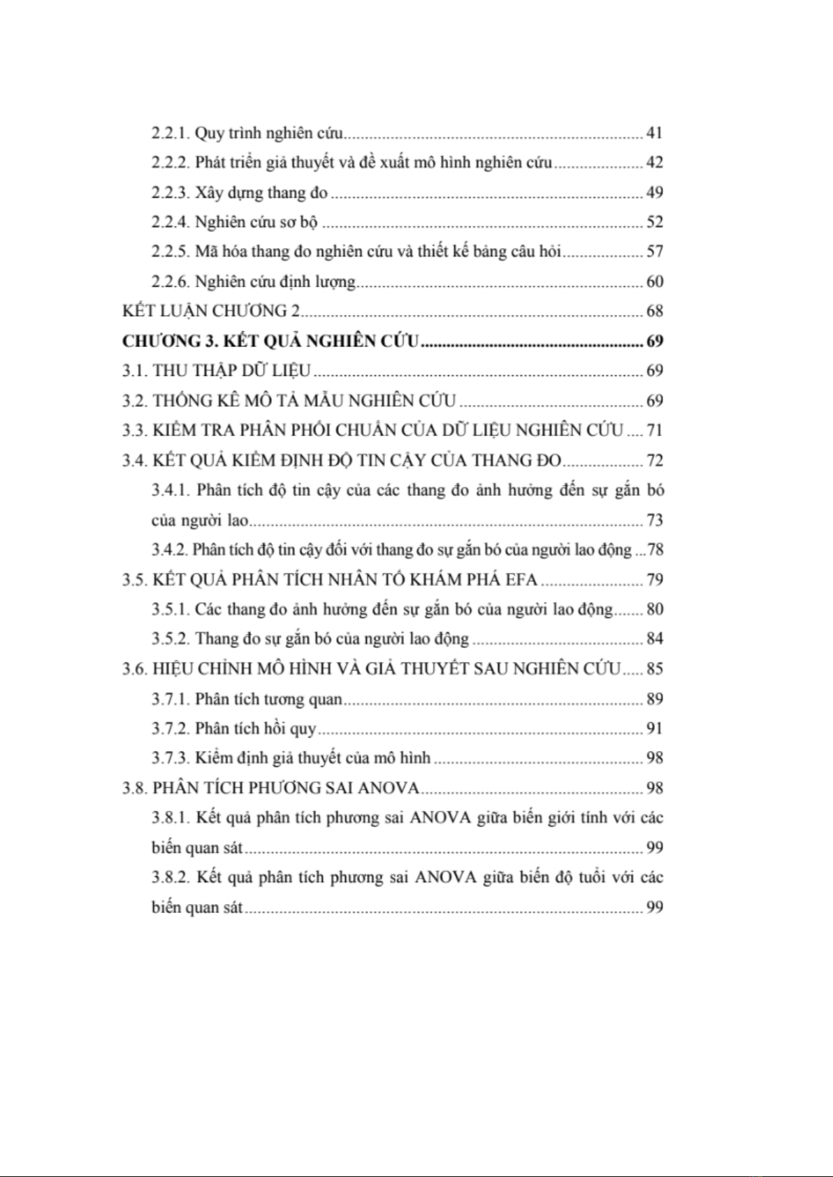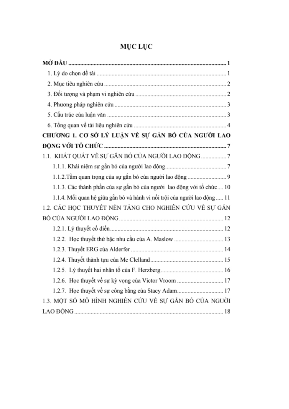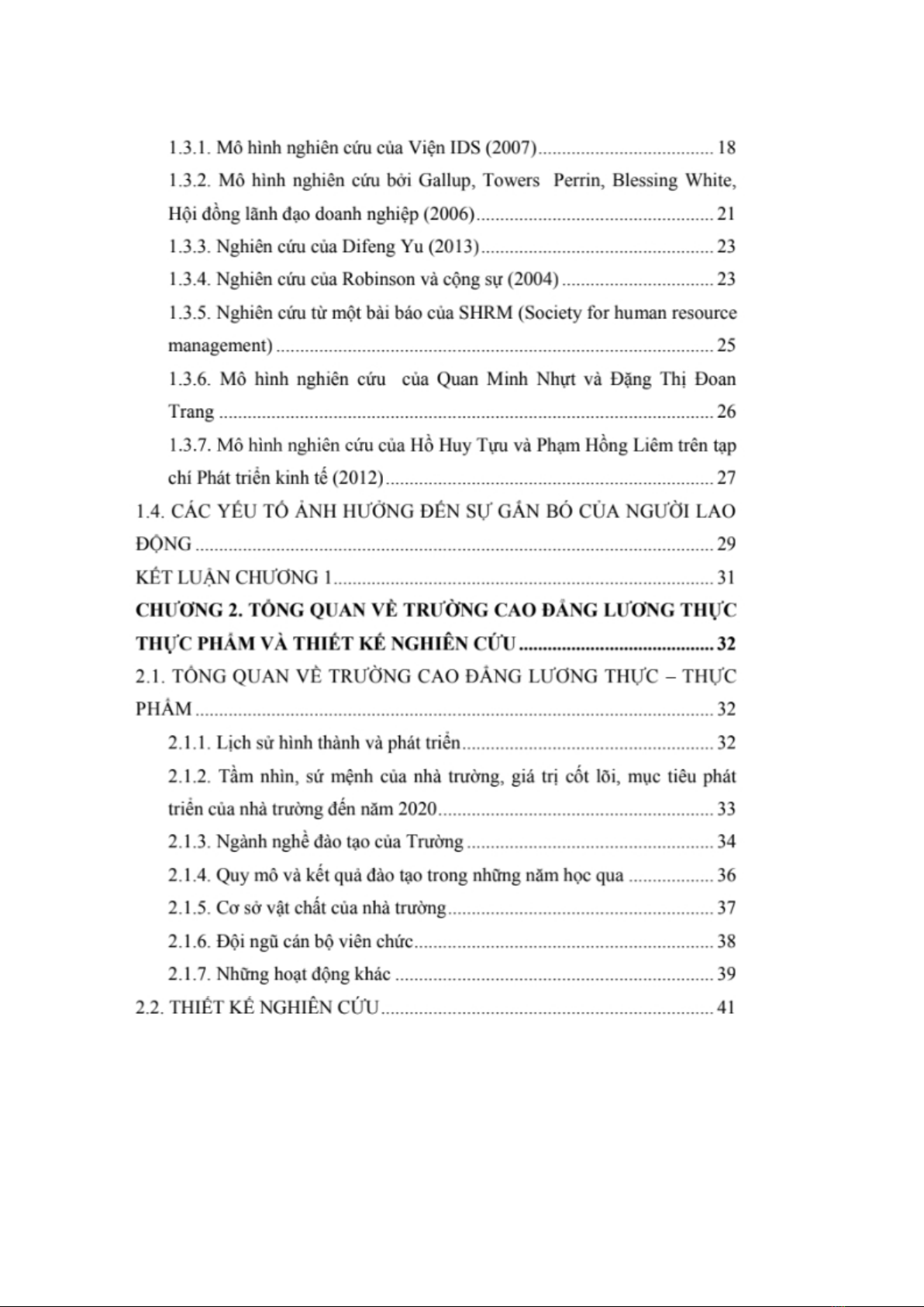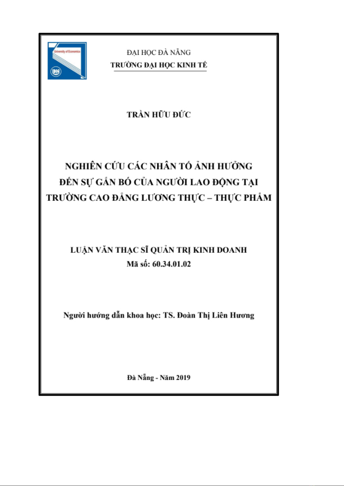 Luận văn "Nghiên cứu các nhân tố ảnh hưởng đến sự gắn bó của người lao động tại Trường Cao đẳng Lương thực Thực phẩm" lý luận chung về sự gắn bó của người lao động đối với tổ chức, tổng quan về trường Cao đẳng Lương thực Thực phẩm và thiết kế nghiên cứu, kết quả nghiên cứu, hàm ý chính sách nhằm nâng cao sự gắn bó của người lao động đối với trường Cao đẳng Lương thực Thực phẩm.